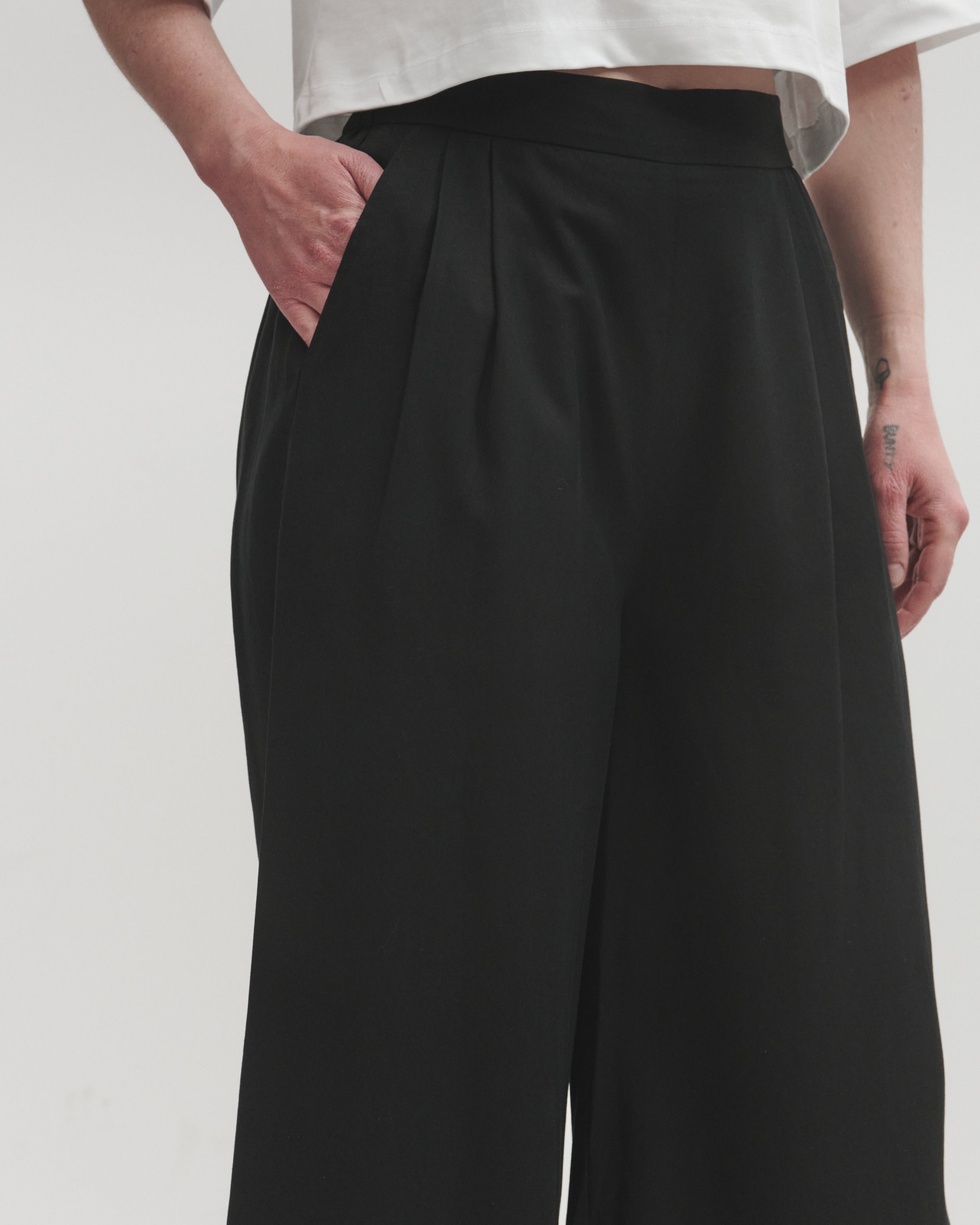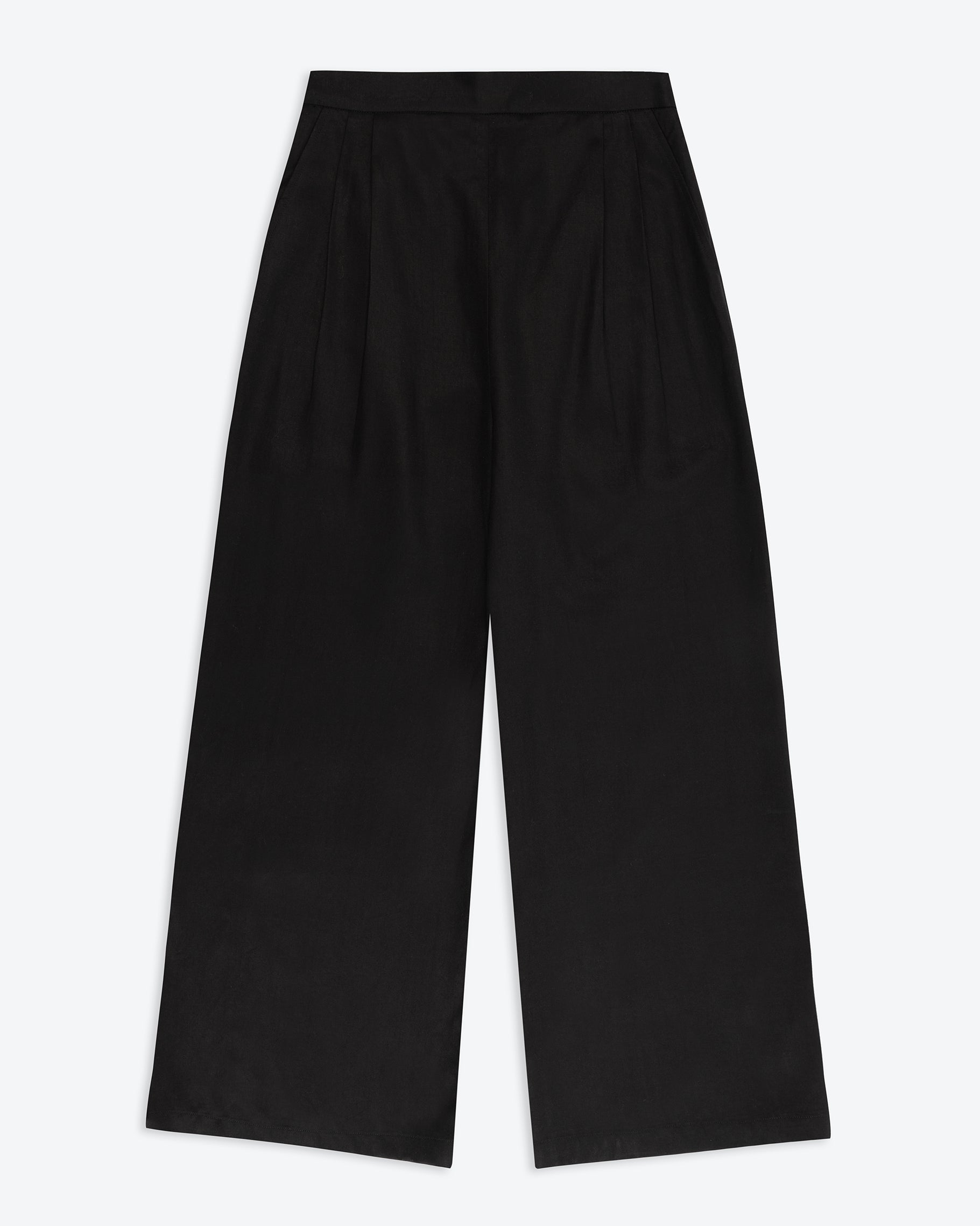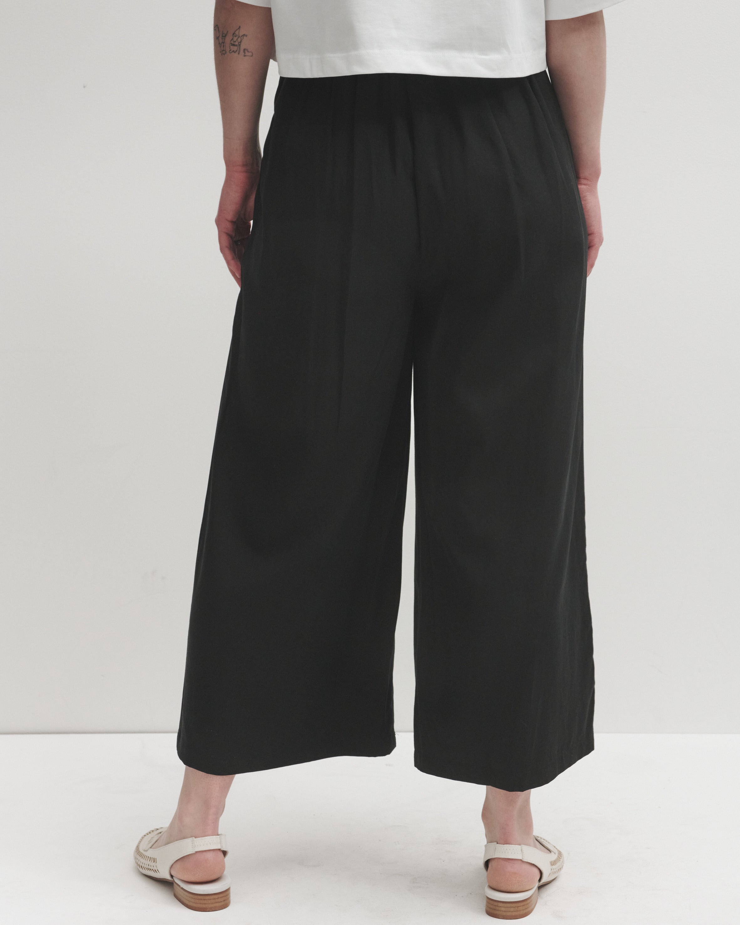 The black lyocell wide-leg trousers are the perfect blend of comfort and elegance. Designed with flattering pleats and an elasticated back for a flexible fit, they offer both structure and ease. The side zip ensures a sleek silhouette, while the pleats and wide-leg cut drape beautifully to a cropped look. Crafted from soft, breathable natural lyocell, they provide a lightweight feel with a graceful flow.