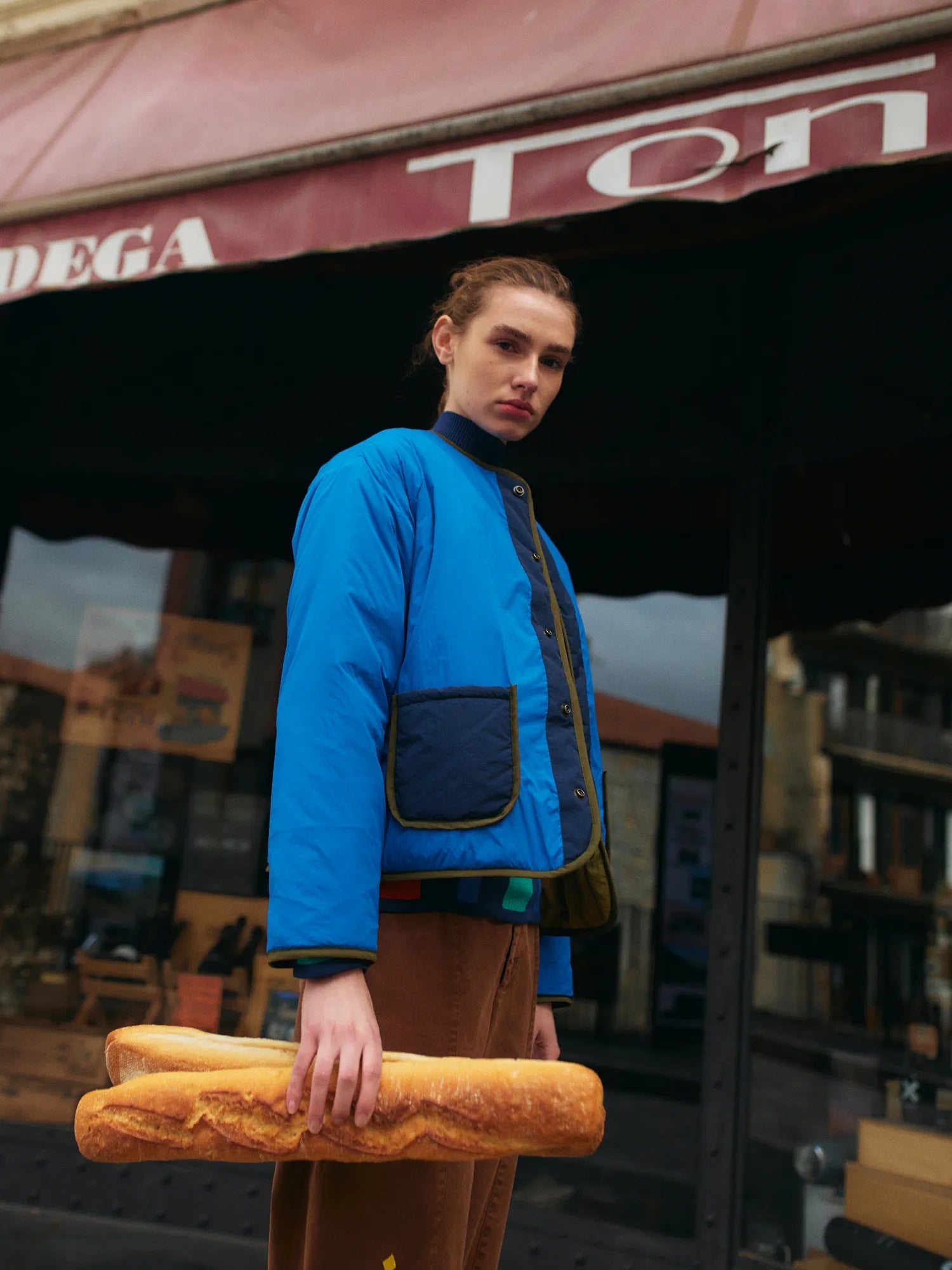 Multicoloured reversible puffer coat by Bobo Choses. This jacket is lightly wadded making it super cosy and malleable. On the one side it's tones of blue and on the other a more khaki green colourway. Designed with slightly loose fit, dropped shoulders and simple popper front opening.