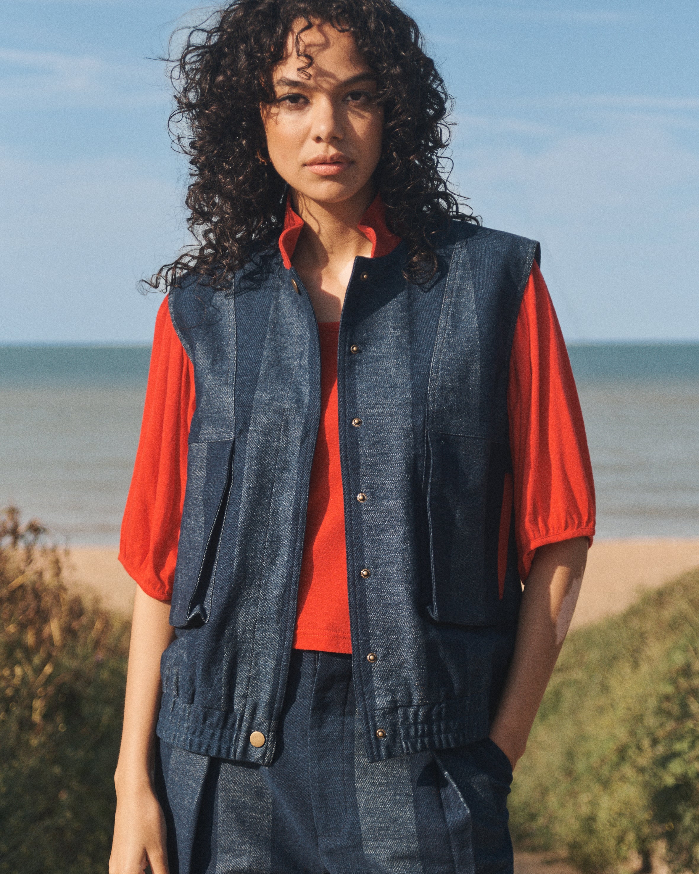 Our stripe denim gilet draws inspiration from the 80's. Sling on top of a chunky knit or cute shirt and away you go. The gilet is packed with detail and pocket space. Pleats at the back reveal the contrast red cotton drill which is also featured on the front pocket placket and collar.