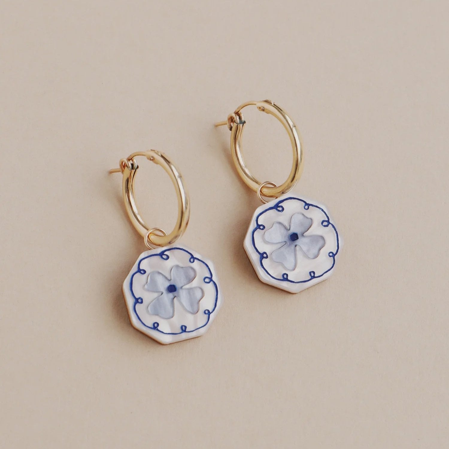 New Poppy Charm Hoops by London-based Wolf & Moon. Inspired by English and Dutch delft tiles, these 19mm 14k gold-filled hoops are lightweight, comfortable, and easy to wear.