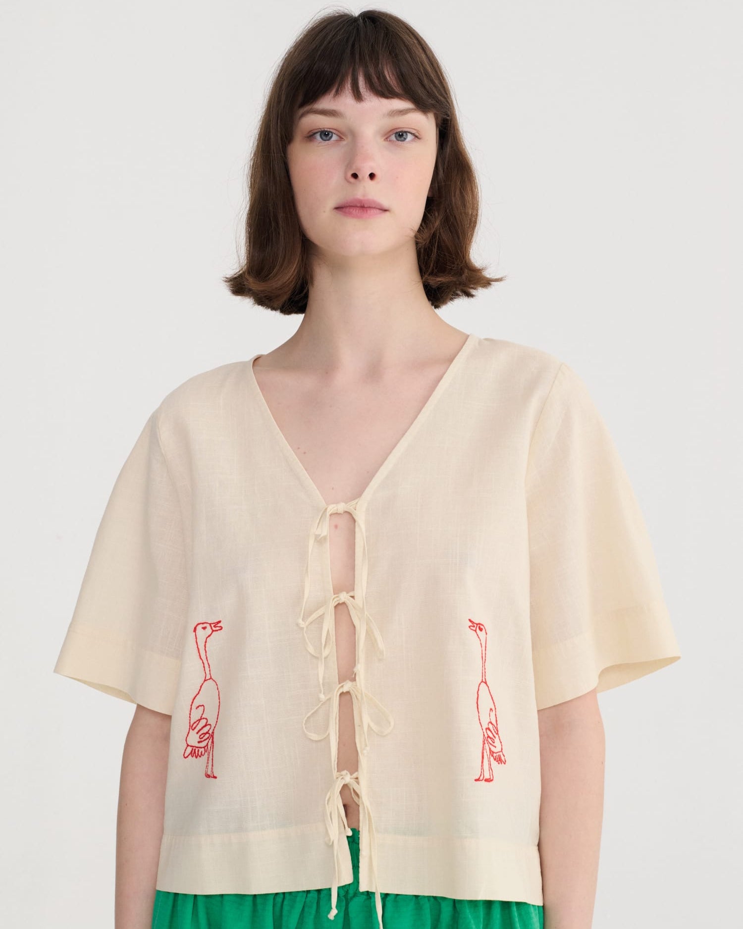Finished with short sleeves and embroidered goose motifs on the front, it’s an easy, breathable piece that works well paired with trousers, skirts or layered over a simple dress.