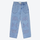 FEATURES: Mid-rise, carpenter style, relaxed straight leg, embroidery