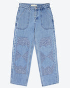 The stevie jean is a carpenter shape straight-leg blue jean with a center front seam. Carpenter patches on the front legs are adorned with embroidery stitches in lines to outline graphic hearts. These extra special jeans are such a unique and fun addition to your spring wardrobe.