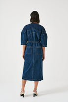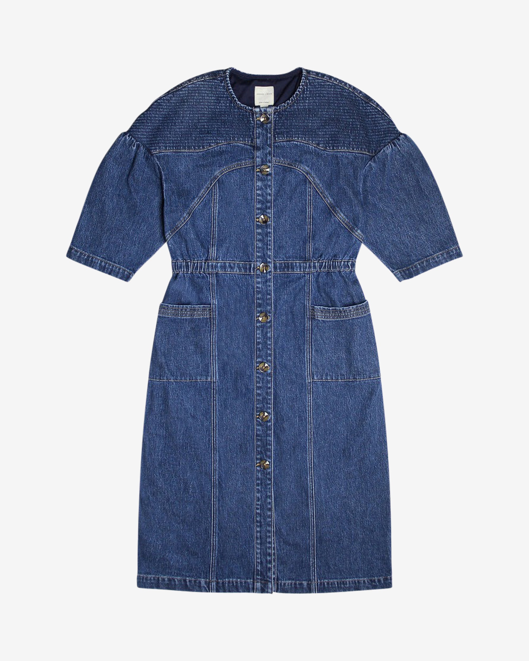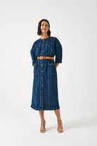 Seventy & Mochi mid blue denim dress. This straight cut dress is gathered at the waist with elastic and has buttons all down the front. Wide sleeves come down just past the elbow. Seam detail down the front gives the dress a slim silhoutte.