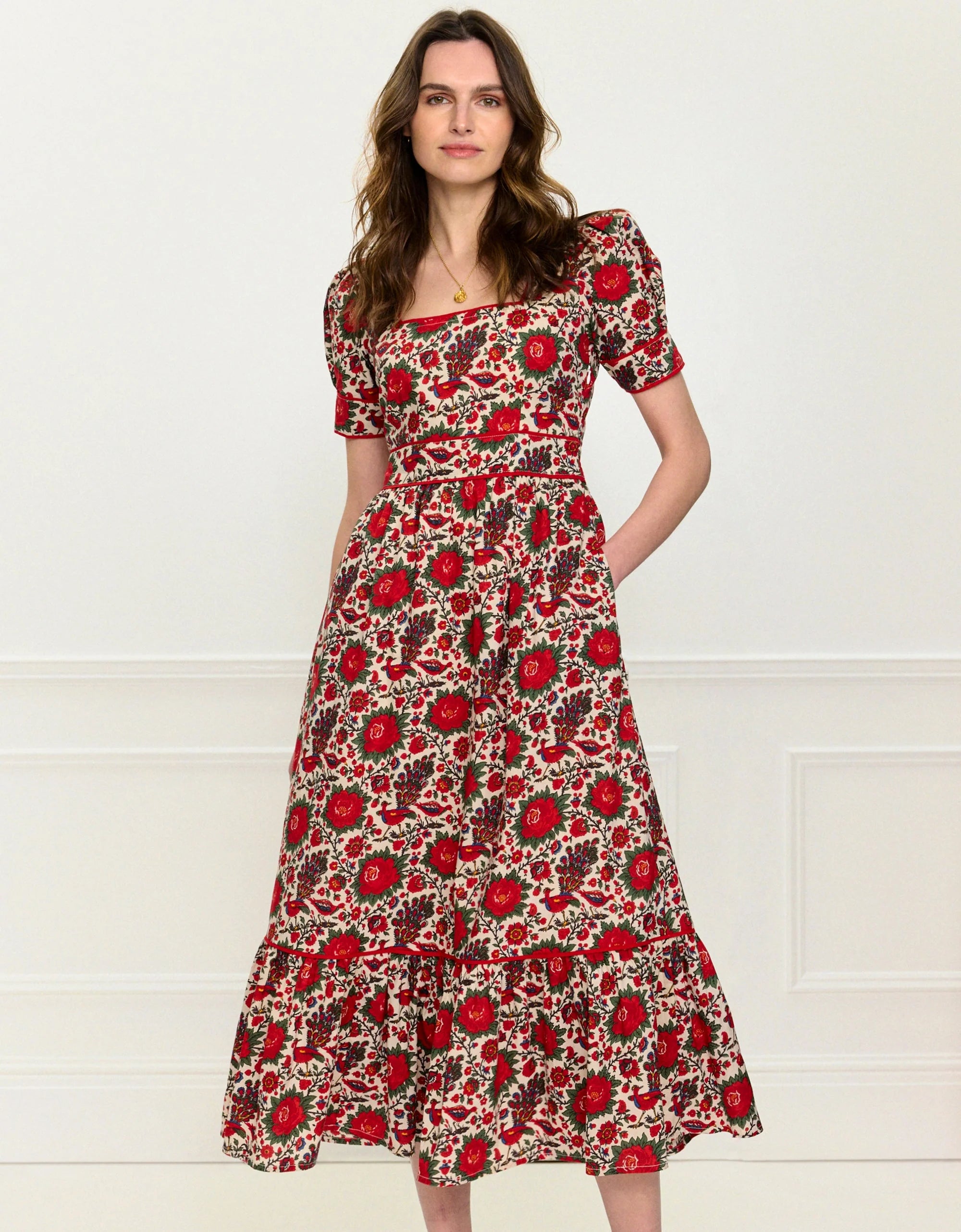 A truly special piece by Pink City Prints, the Peony Bird Evelyn Dress is crafted from crisp cotton poplin and screen-printed by hand with peacocks and blooming flowers. With a flattering square neckline, fitted waistband and bow tie at the back, it’s the perfect choice for weddings and occasions. Finished with a flowing, maxi-length skirt and red contrast trim.