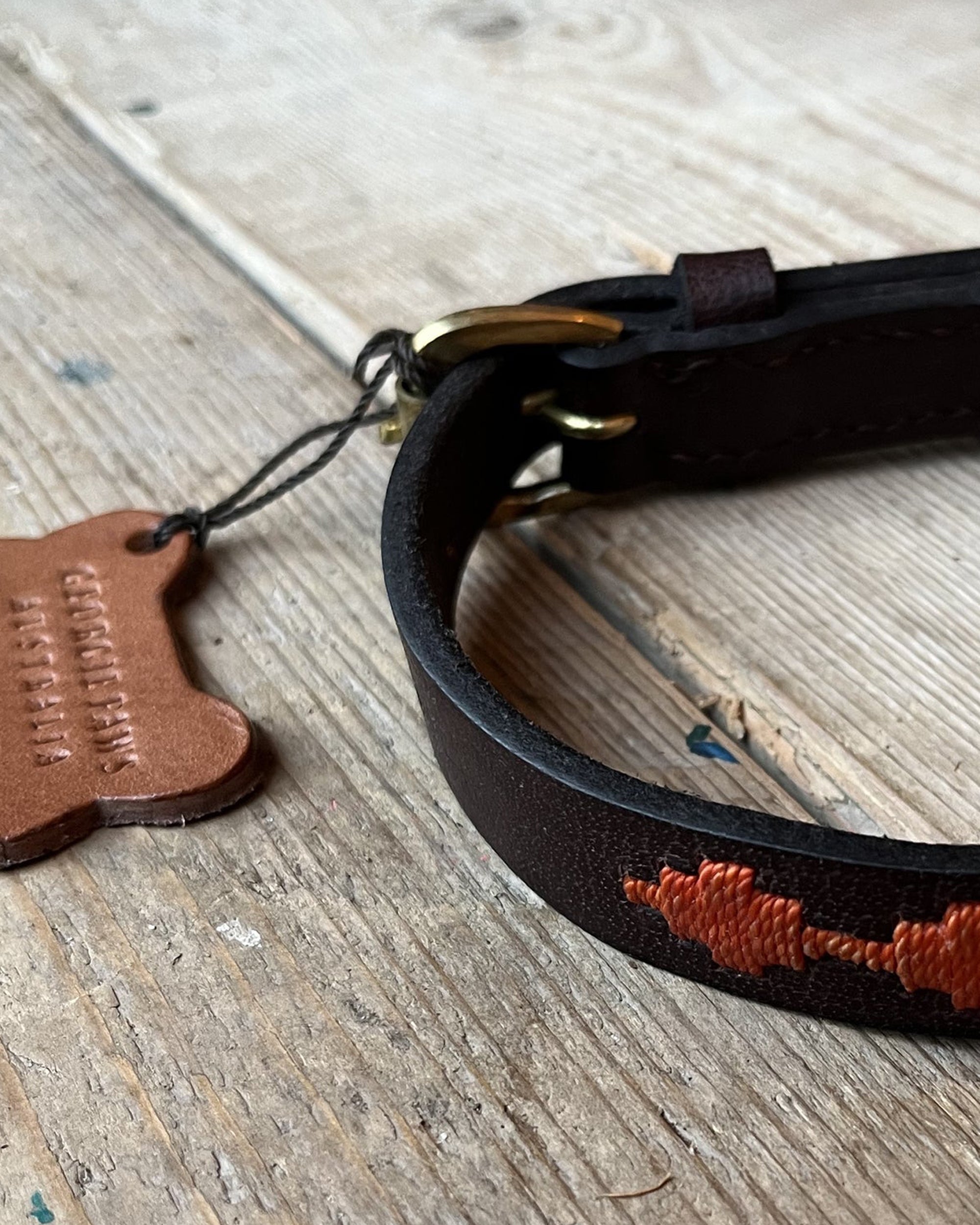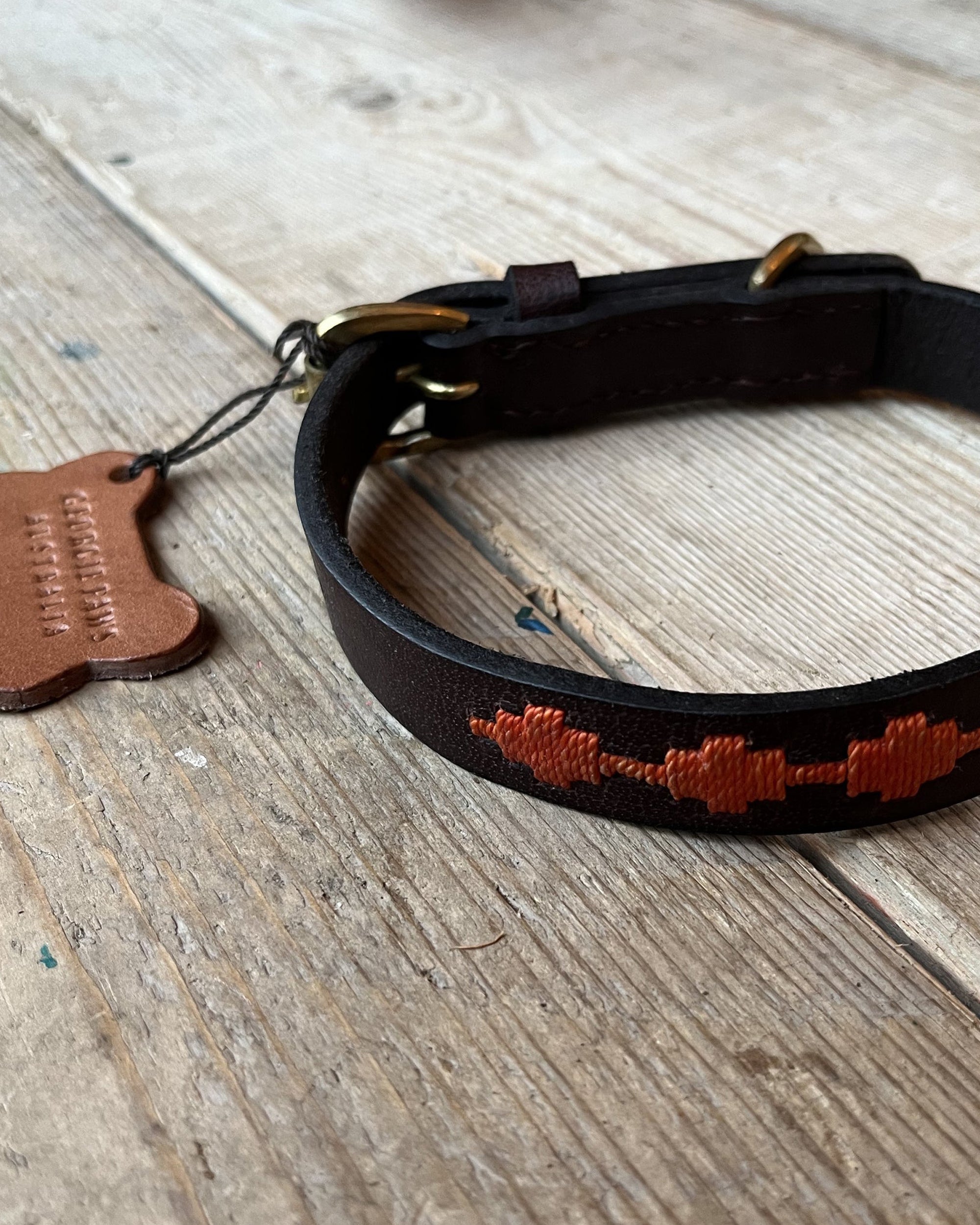 The bark collar is embroidered in an ocre coloured waxed thread. Hand embroidered in Pakistan onto high quality buffalo leather.