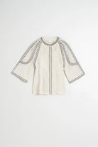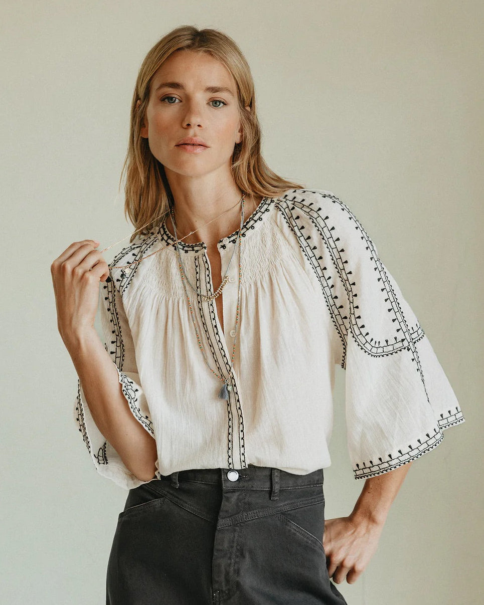 A relaxed cotton shirt with a softly structured shape and embroidered detailing. Cut for an easy, boxy fit, it features gentle bell sleeves with subtle volume and a clean, hidden button-through front.