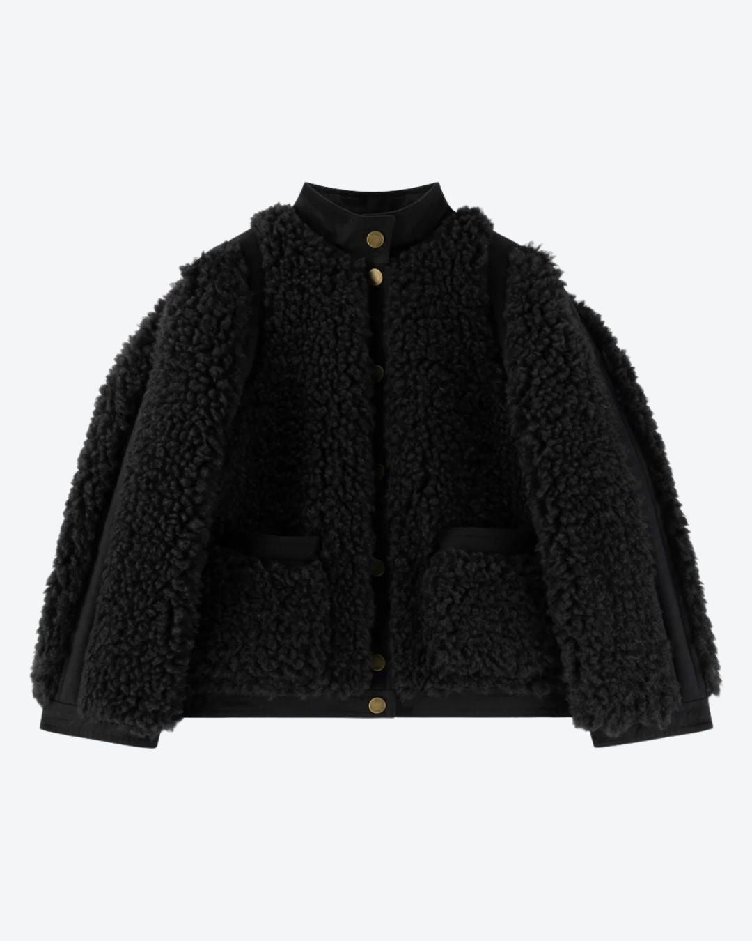 FEATURES: Boucle texture, Loose volume, Cropped cut, High collar with button placket, Round buttons at the front, Two patch pockets, Puff sleeves, smooth panels