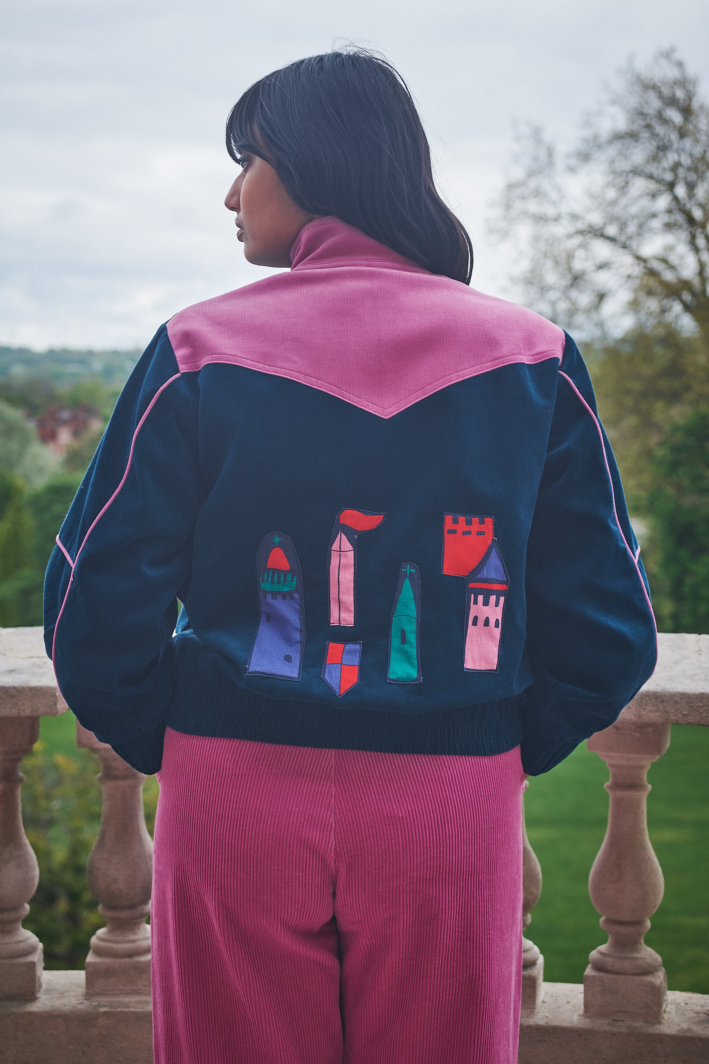 Our needlecord castle jacket is a true original. Using pink and navy needlecord, the bomber jacket has ample pocket space, elasticated cuffs and hem. The back of the jacket is covered in applique patches of colourful handdrawn castles. Quilted inside this jacket is not just for show and will keep you warm and will fit a knit underneath.