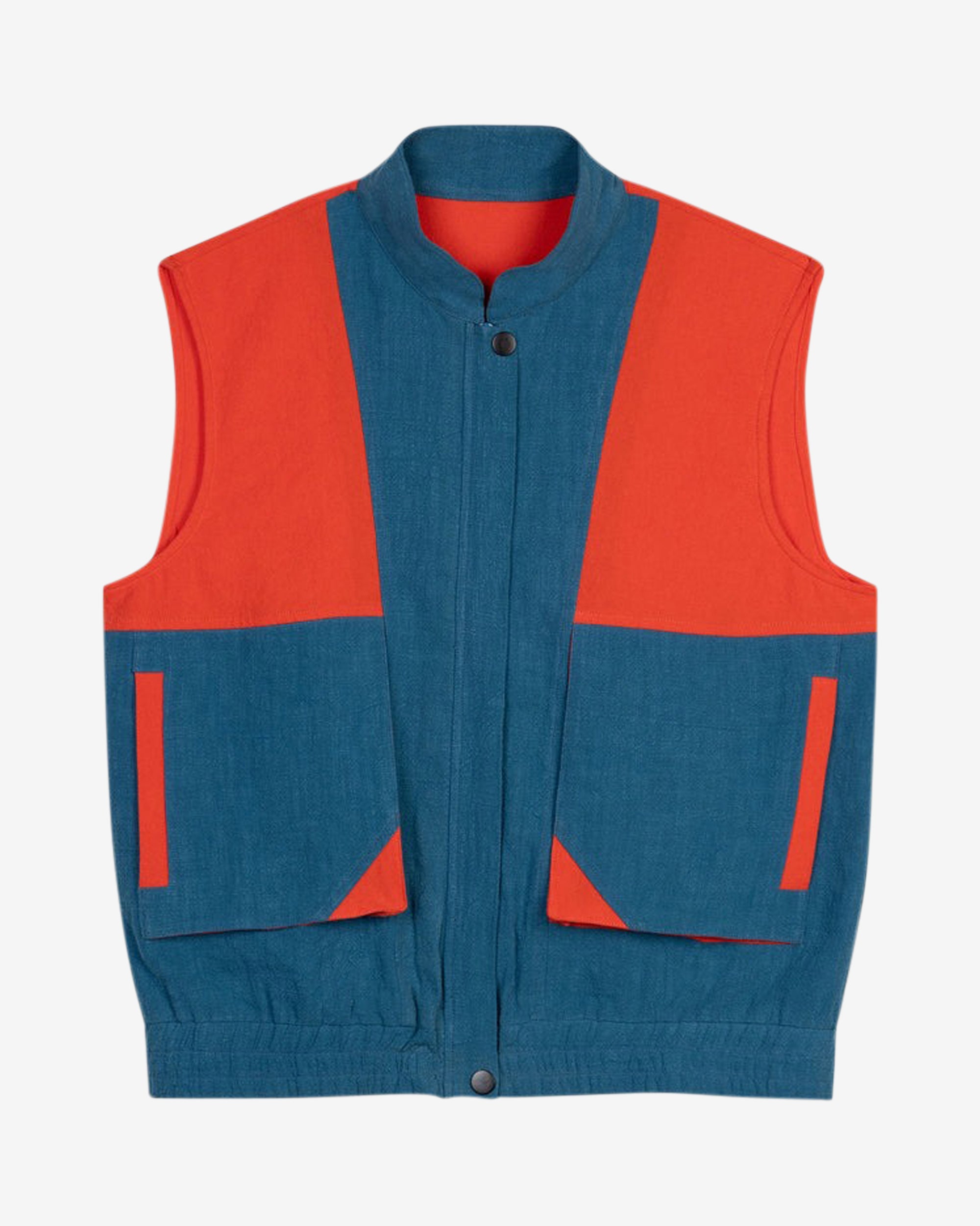 This two tone gilet is a great statement piece for your wardrobe this Spring/ Summer. Taking inspiration from 80's sportswear our sleeveless bomber jacket has deep side pockets with contrast panelling, poppers and a front zip. Throw over a boilersuit or jumper when you need extra pockets or a bit more warmth.