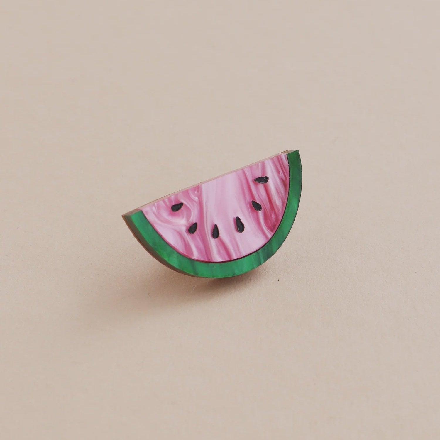 New Wolf & Moon Watermelon Pin made from acrylic with hand-inked details.