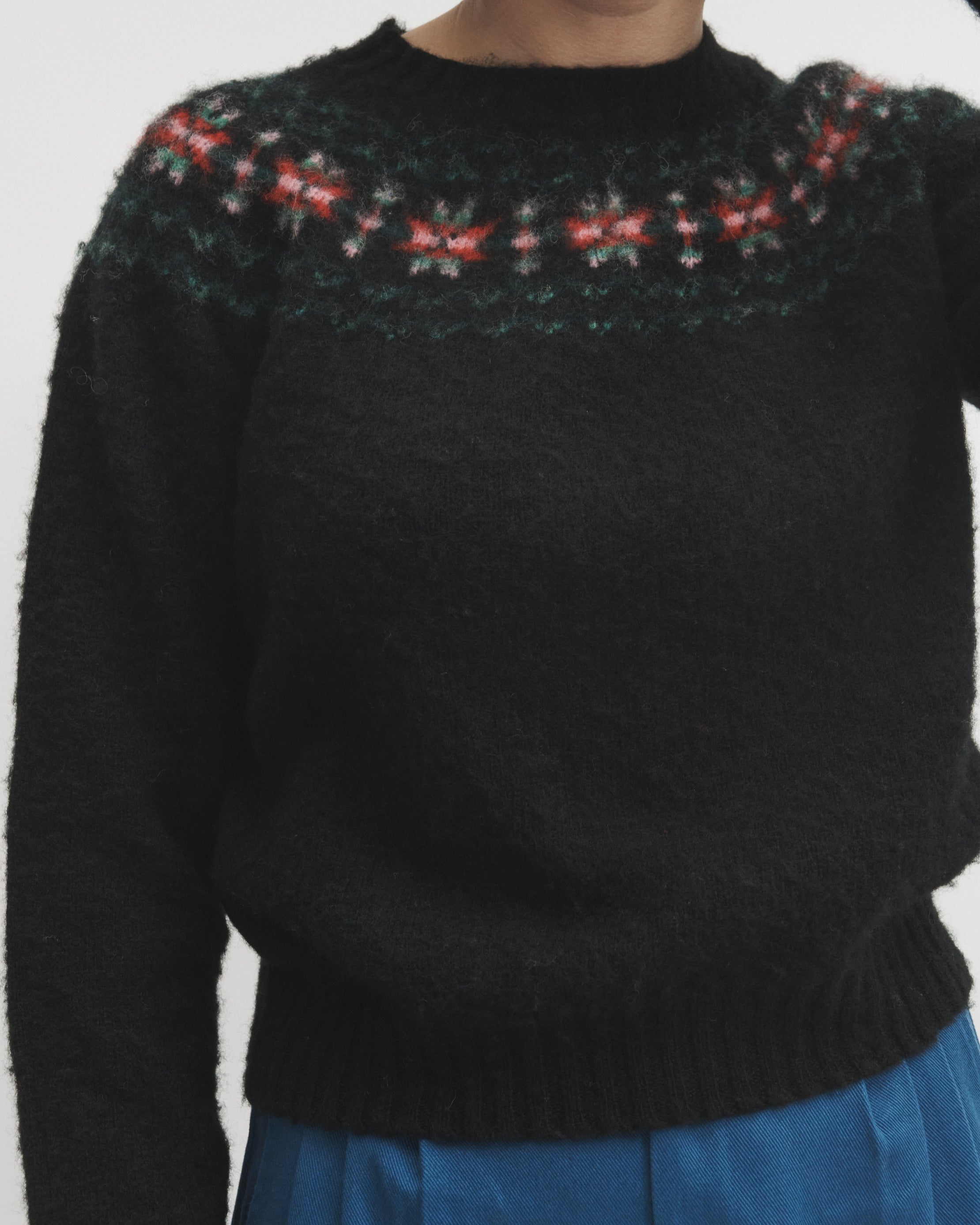 Our black brushed fair isle jumper is traditionally knitted using a seamfree method. It's multi coloured fair isle is knitted into a black base. Lowie’s much-loved jumpers are made in Peterhead, a small fishing port in Scotland, by one of the few remaining knitwear suppliers in the UK. Knitted from 100% Scottish spun lamb’s wool with traditional Fair Isle style knit design around the neckline.