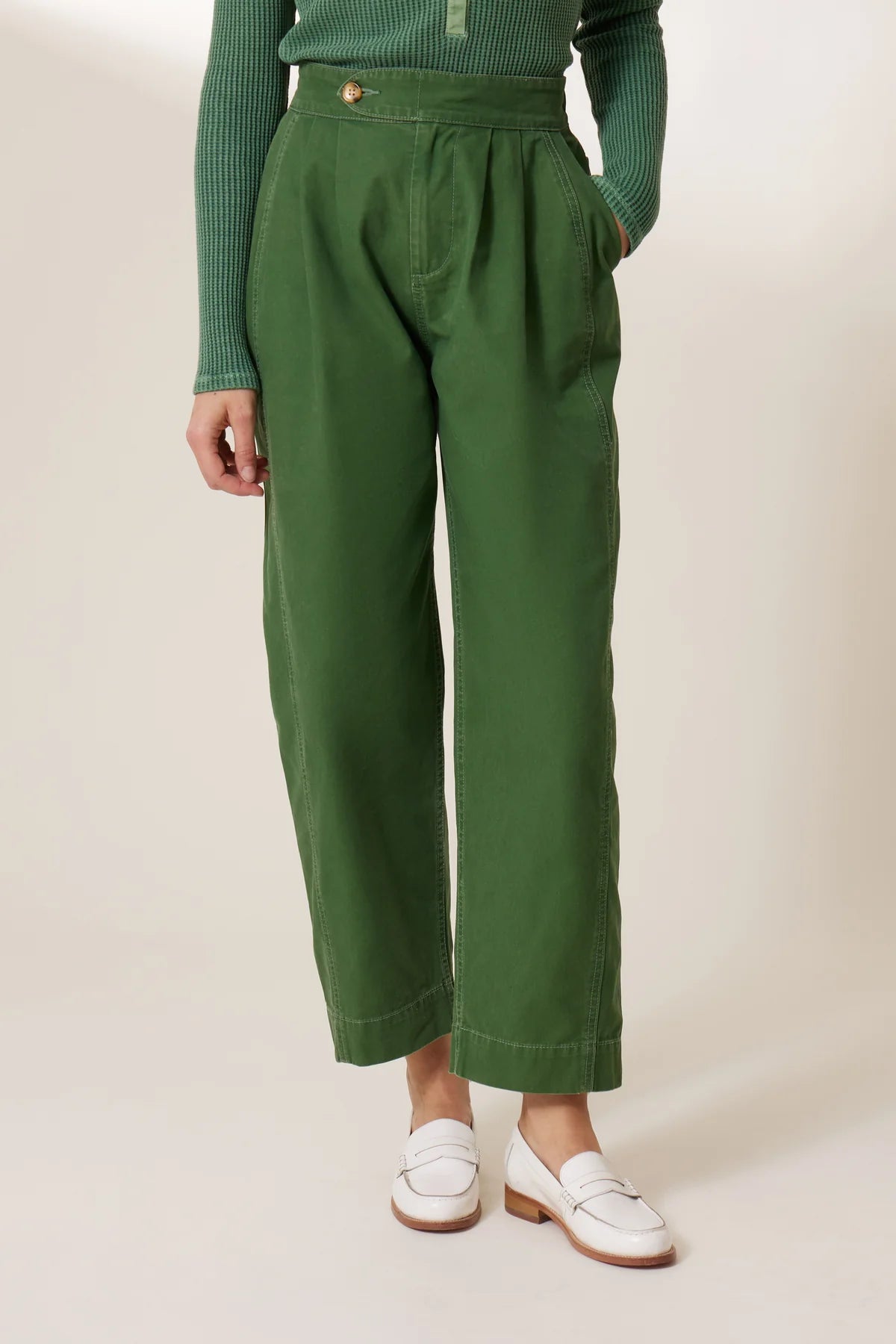 FEATURES: Pleated front, button tab closure, elastic waistband, cotton canvas feel.