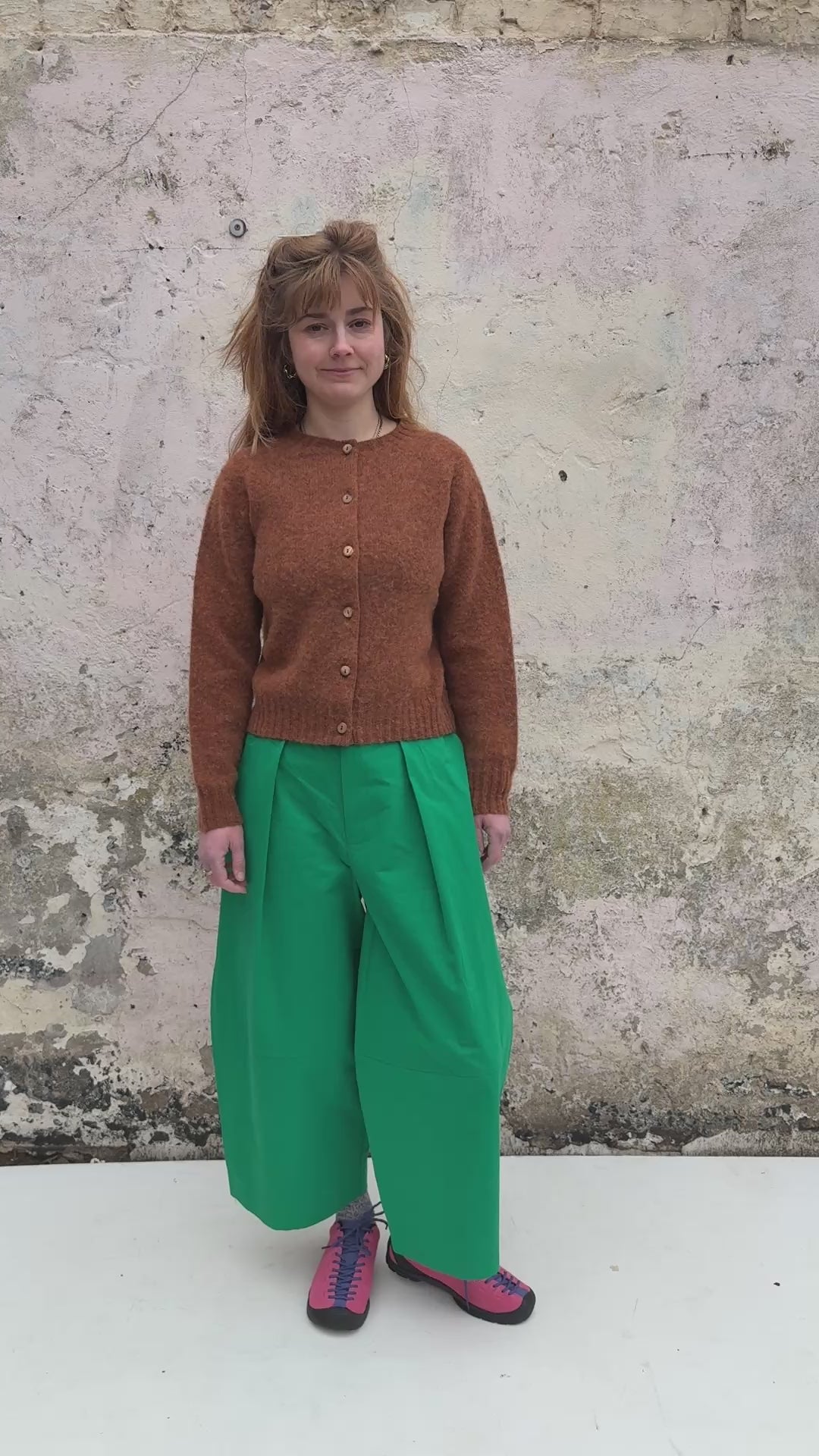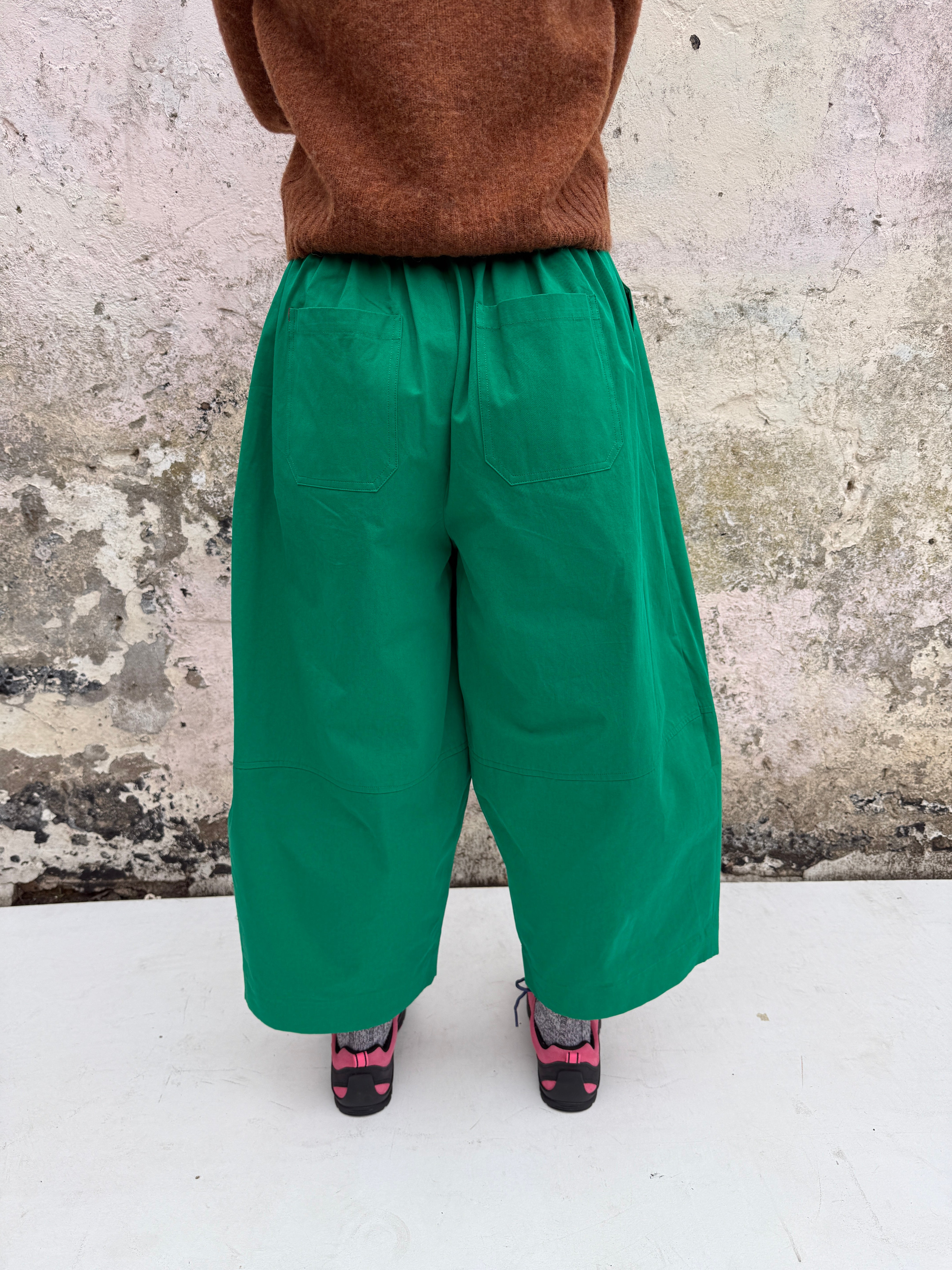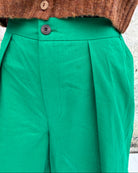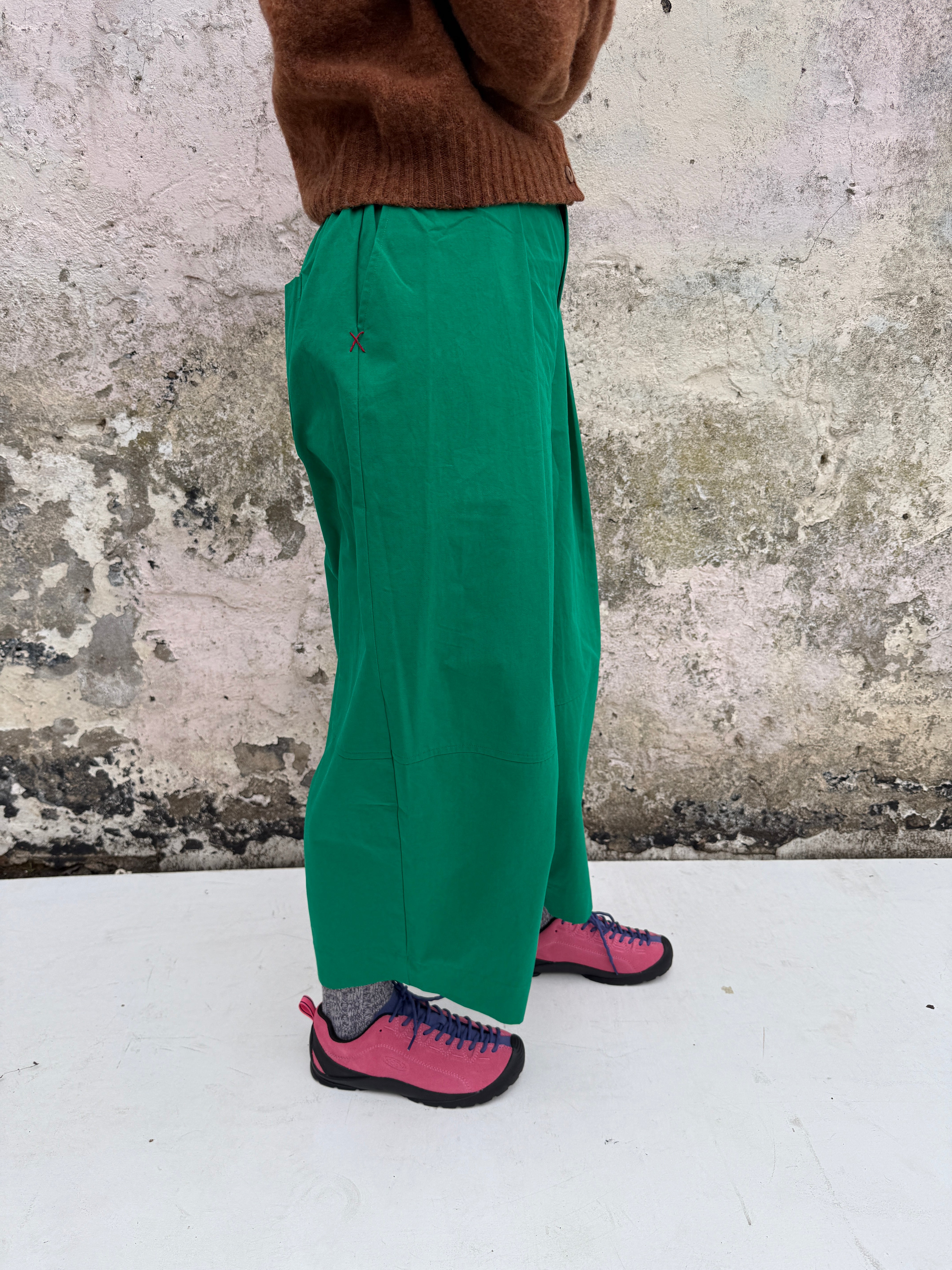 These wide leg green trousers feature soft front pleats and a relaxed, sculptural silhouette, falling to a cropped length with gentle volume through the leg. Crafted from organic cotton in a vibrant emerald green, they hold their shape beautifully while remaining comfortable to wear. Finished with side pockets detailed with subtle red stitching for a signature touch.