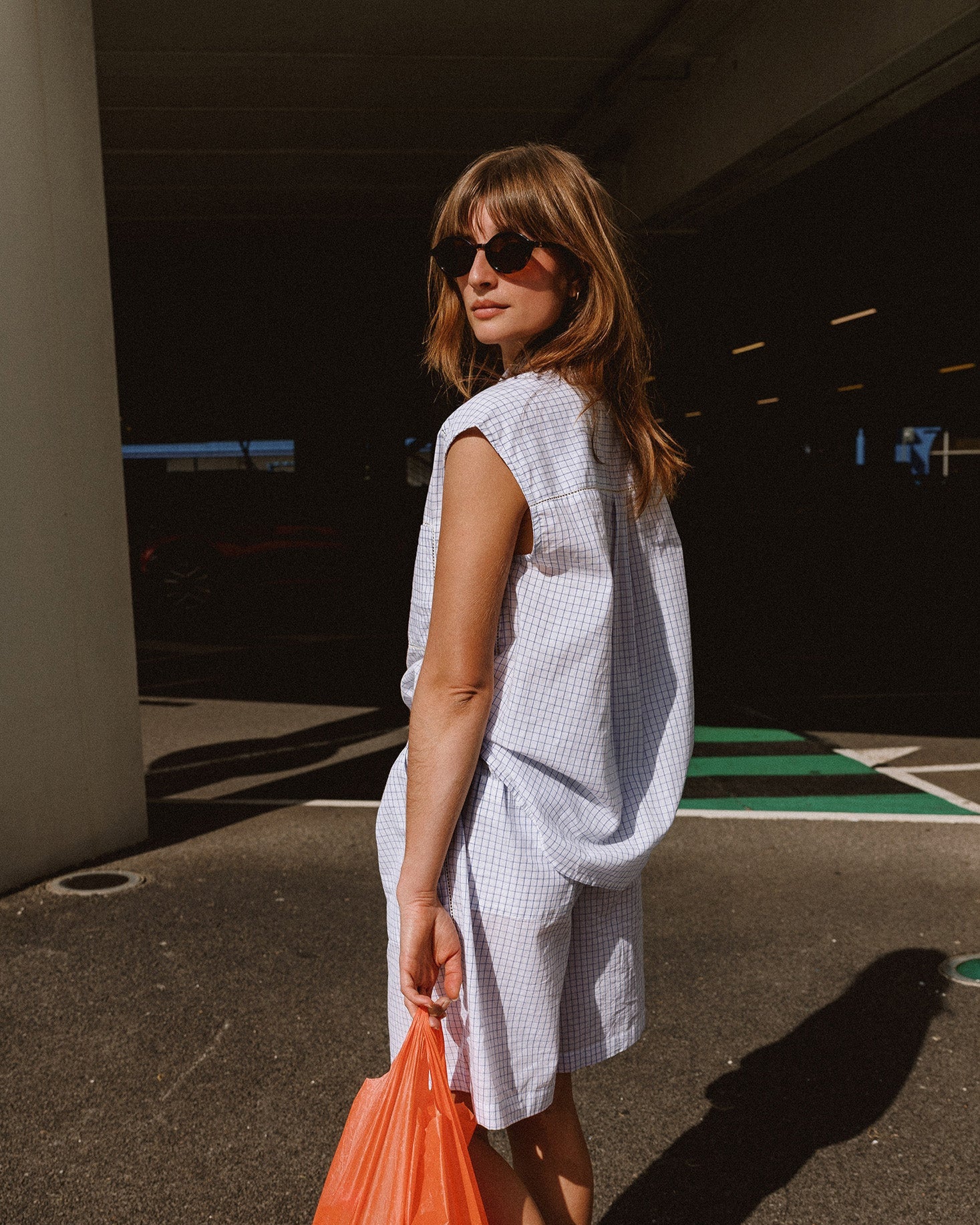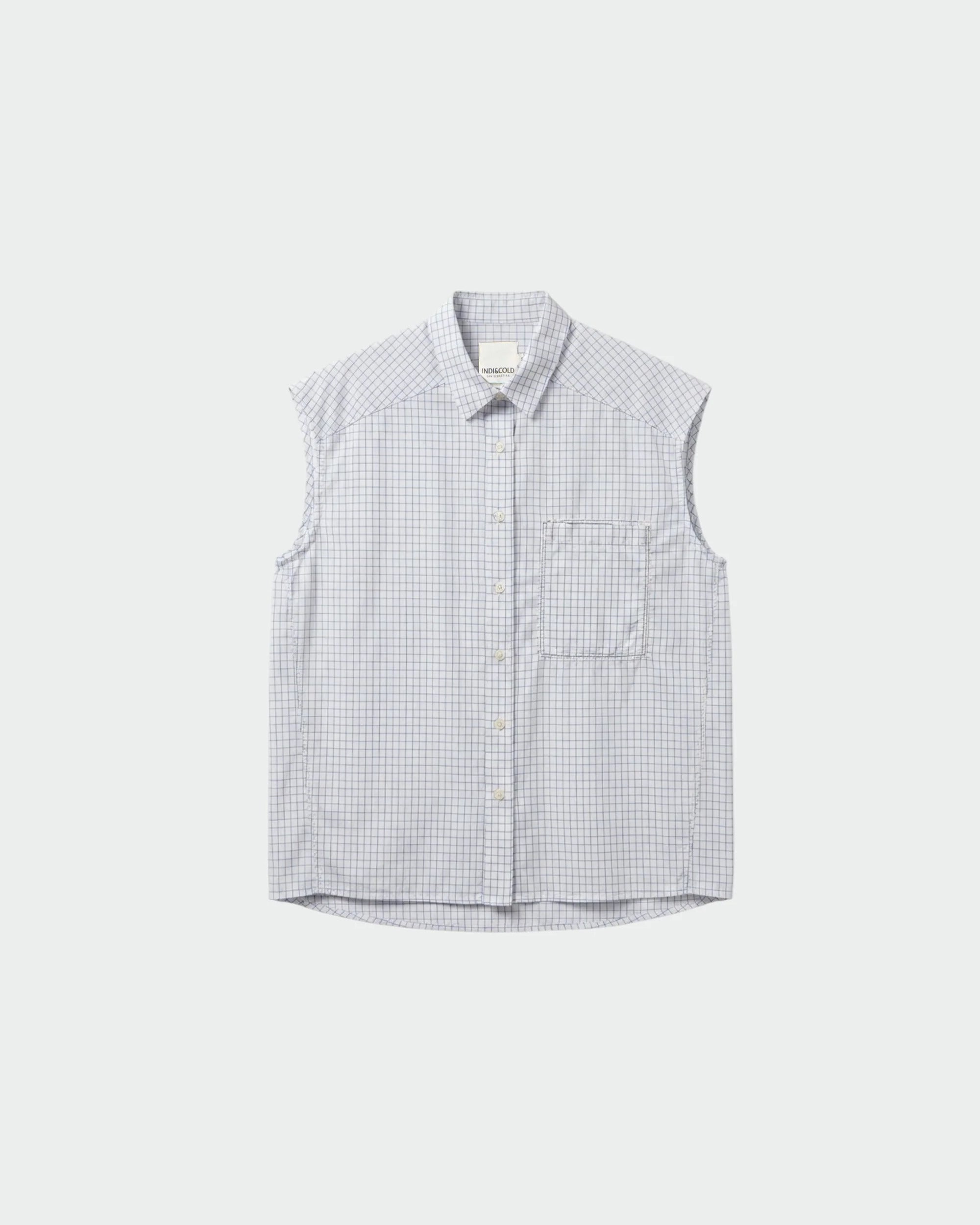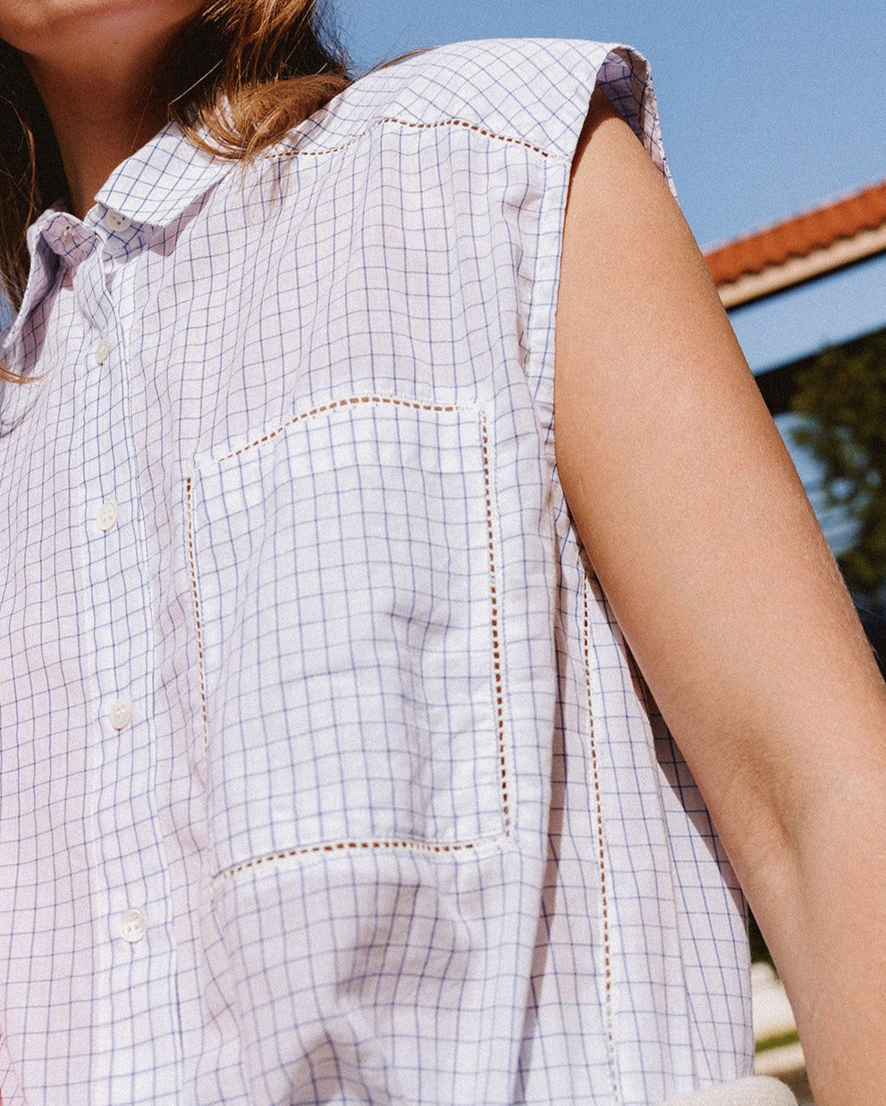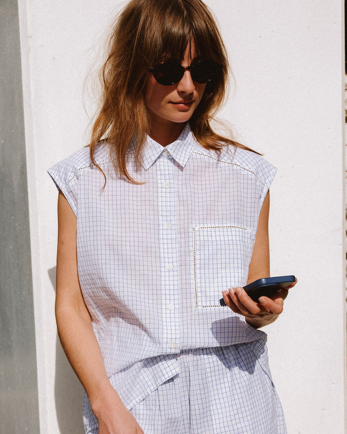 This sleeveless cotton shirt features a classic pointed collar and button-through front, creating a clean, structured silhouette. Designed with a relaxed fit, it falls effortlessly for an easy, everyday shape. Crafted from breathable cotton, it offers a lightweight, comfortable feel. Finished with a maxi chest pocket and subtle seam detailing for a distinctive, considered touch.