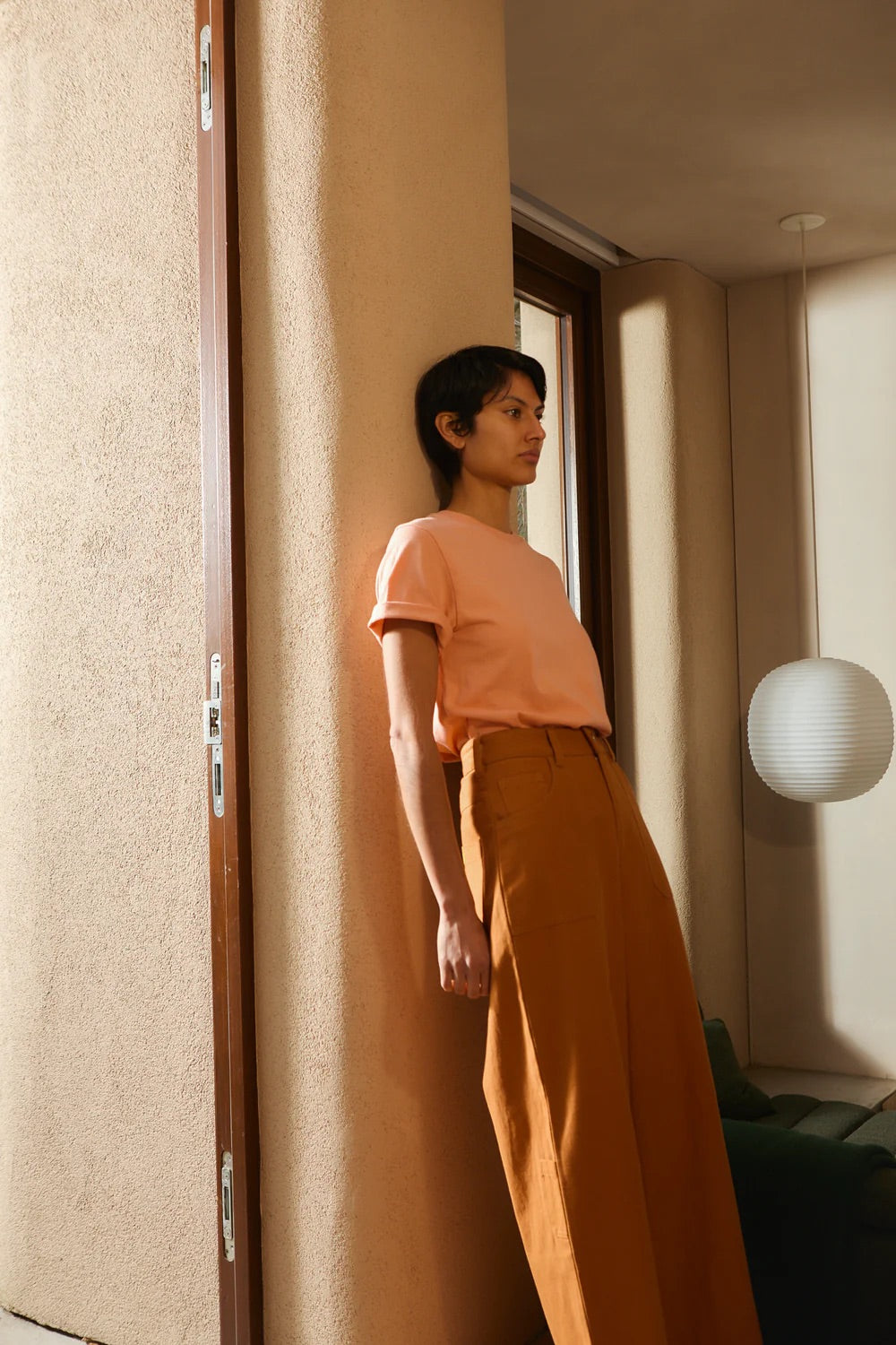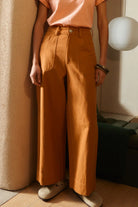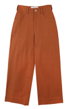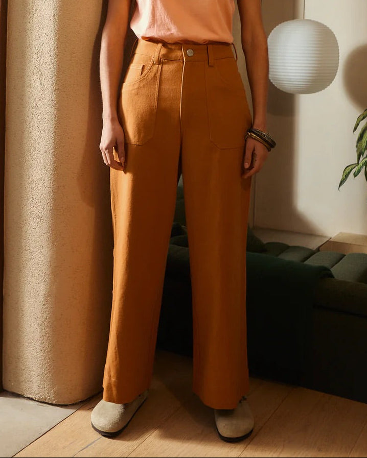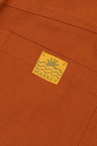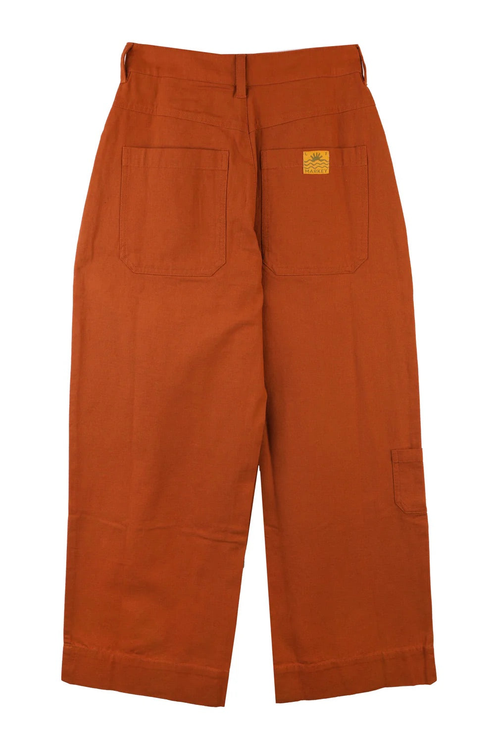 The Carpenter Trouser by LF Markey is a classic workwear staple, fitted at the waist with a straight cut leg. Made from Terracotta cotton canvas. Features angular utility pocket detailing and a small sun and wave logo on the back.