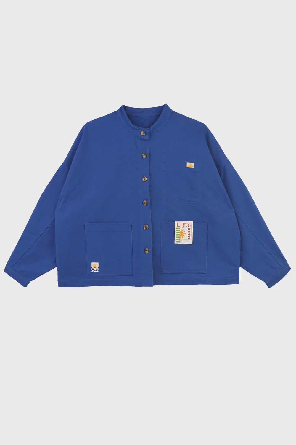L F Markey's take on a classic chore coat with a wide boxy shape, voluminous sleeves and imitation horn buttons down the front. With side seam pockets, front patch pockets and a large removable cardboard label on the left pocket. In vibrant cobalt cotton drill with their signature sun and wave woven patch logos dotted throughout.