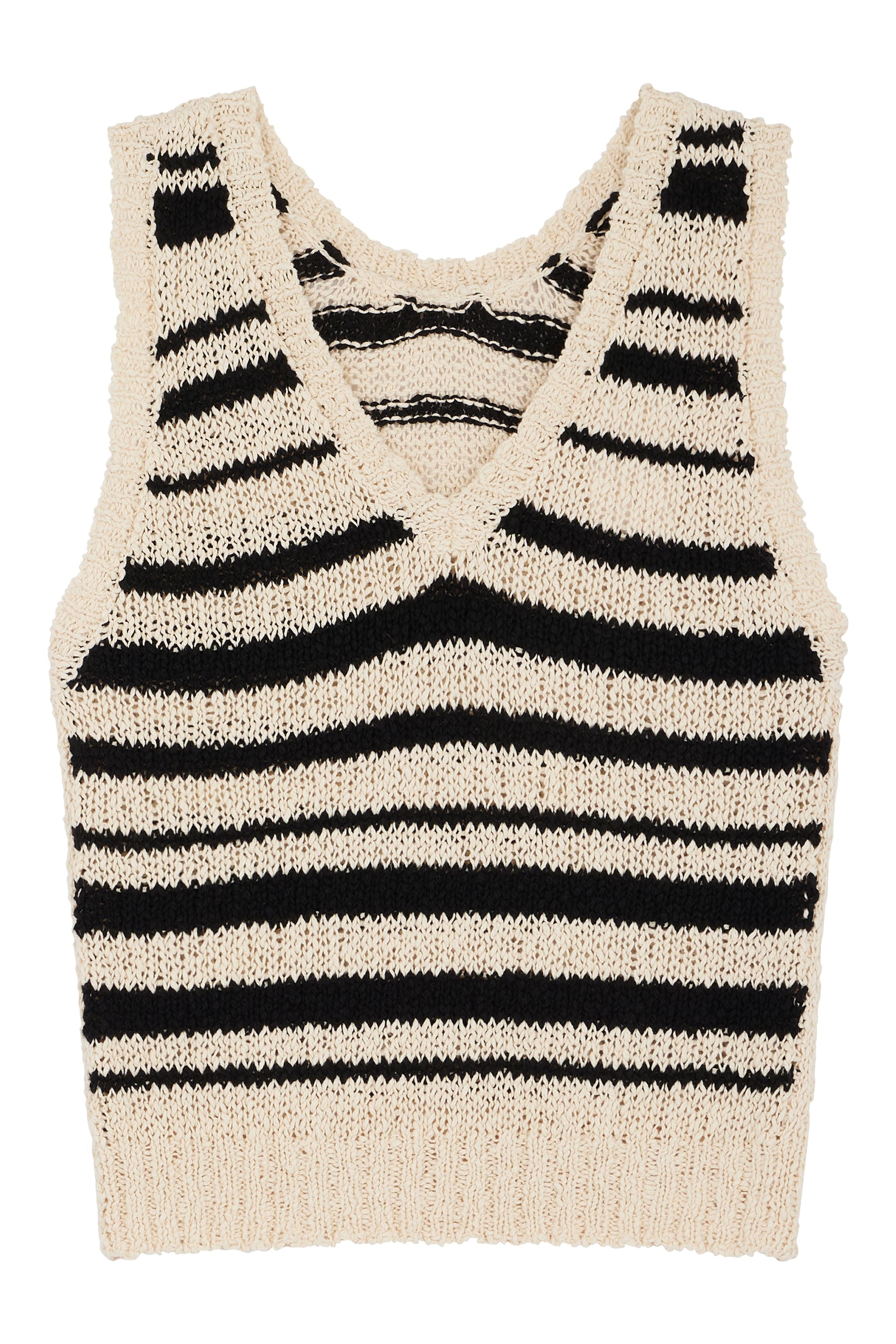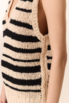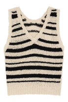 FEATURES: Chunky knit texture, V-neckline, sleeveless design, ribbed trims, relaxed fit, black stripe pattern