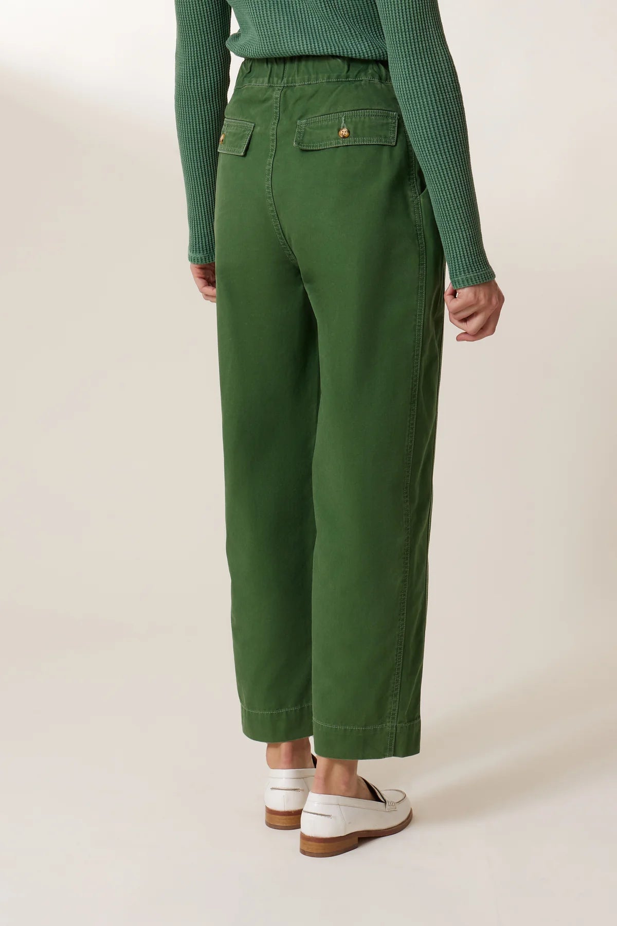 FEATURES: Pleated front, button tab closure, elastic waistband, cotton canvas feel.