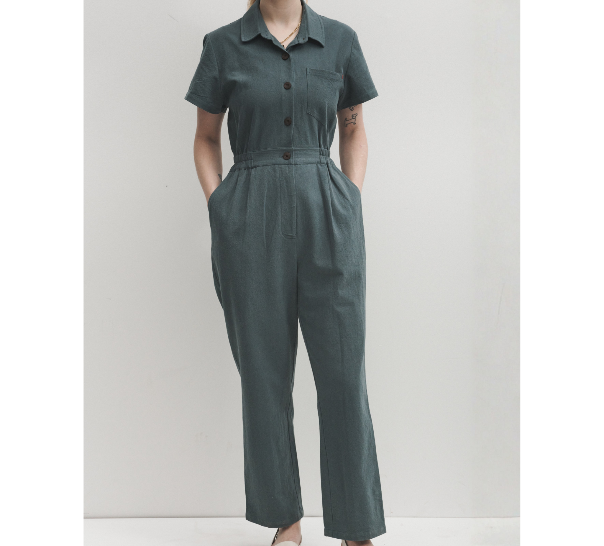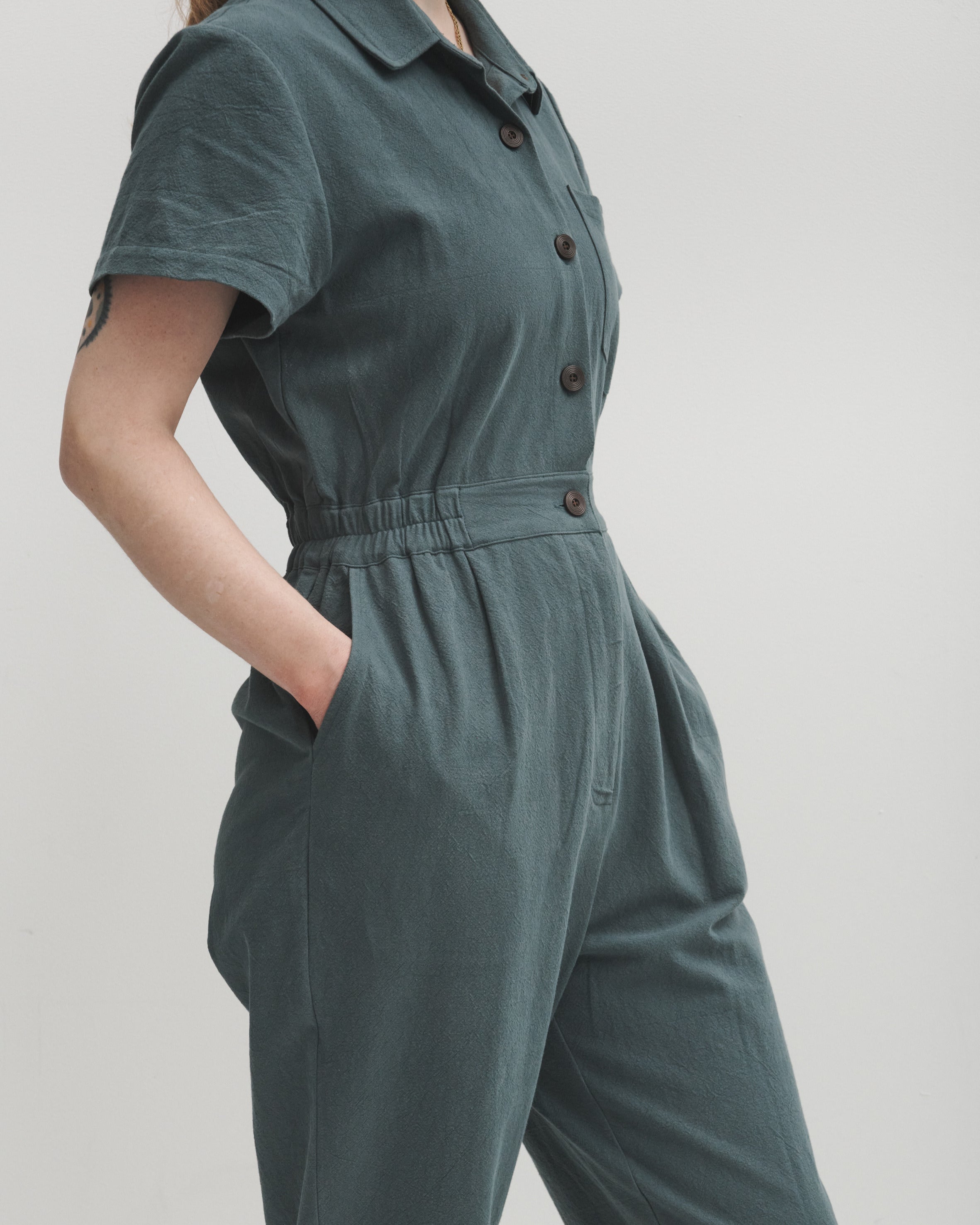 Our short-sleeve sage boilersuit features a classic shirt collar and button-through front, creating a clean, streamlined silhouette. Cut with a softly elasticated waist for shape and comfort, it falls to a full-length straight leg for an easy, modern fit. Crafted from durable cotton in a calming sage, it’s finished with side pockets and a chest pocket.