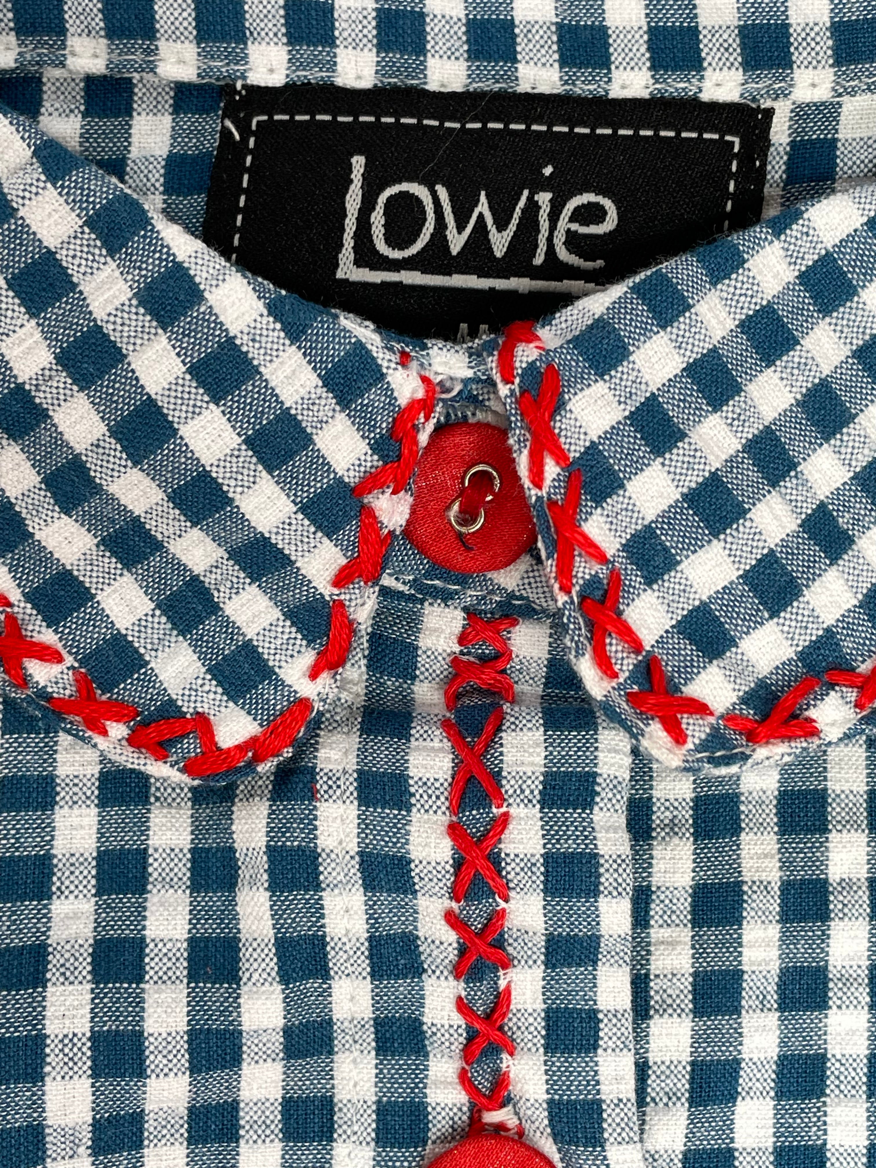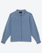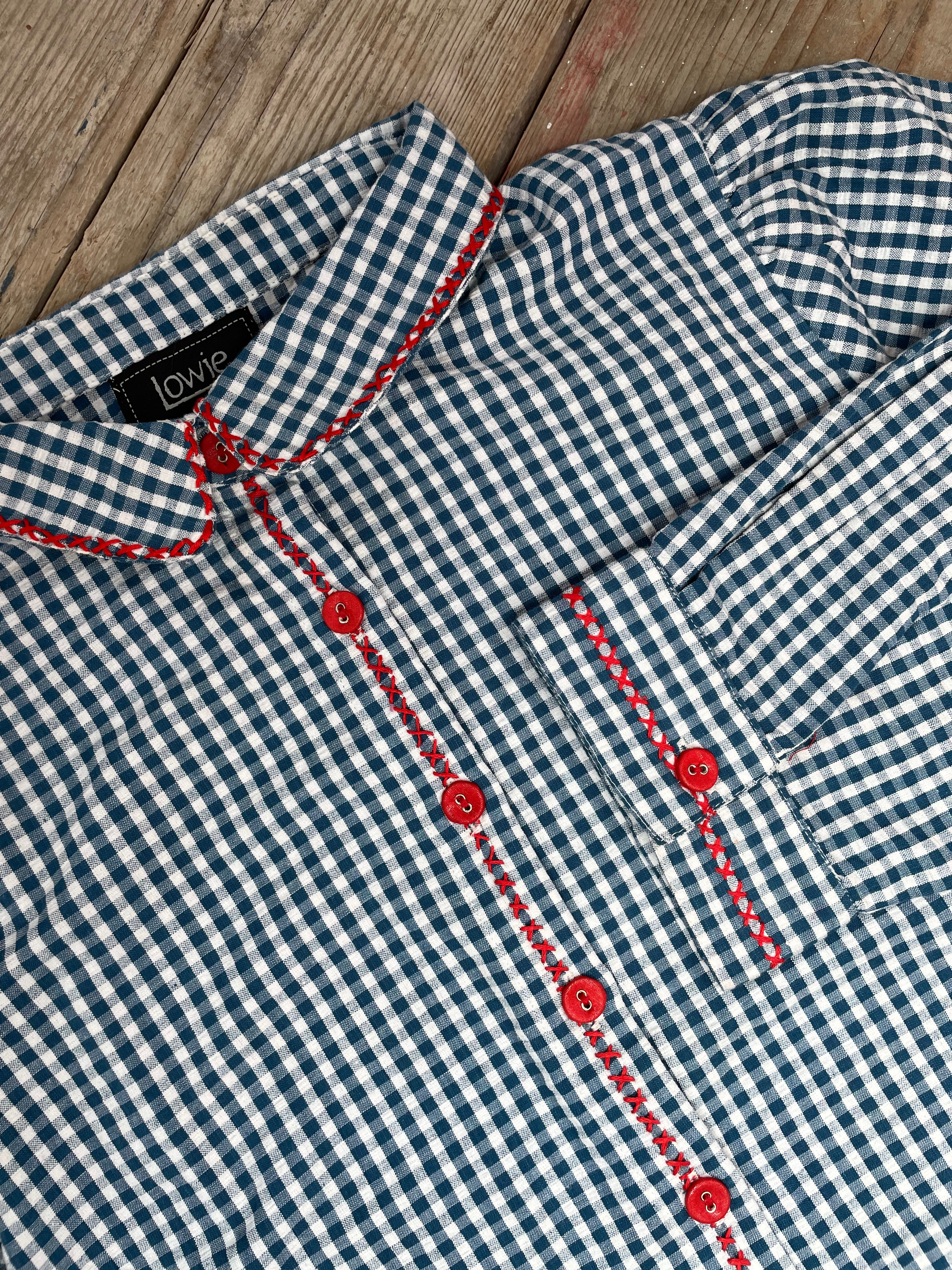 FEATURES: Cotton seersucker fabric, blue and white gingham check, hand-embroidered cross-stitch detailing, red button fastening, chest pocket, classic collar, long sleeves