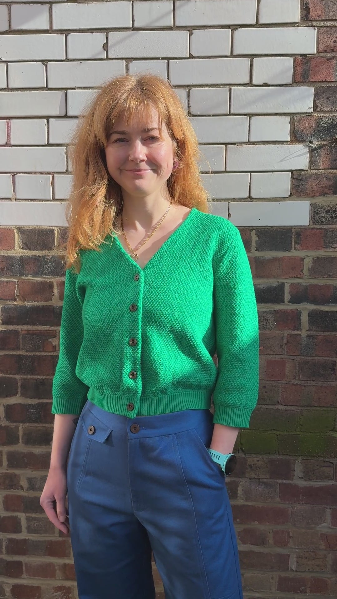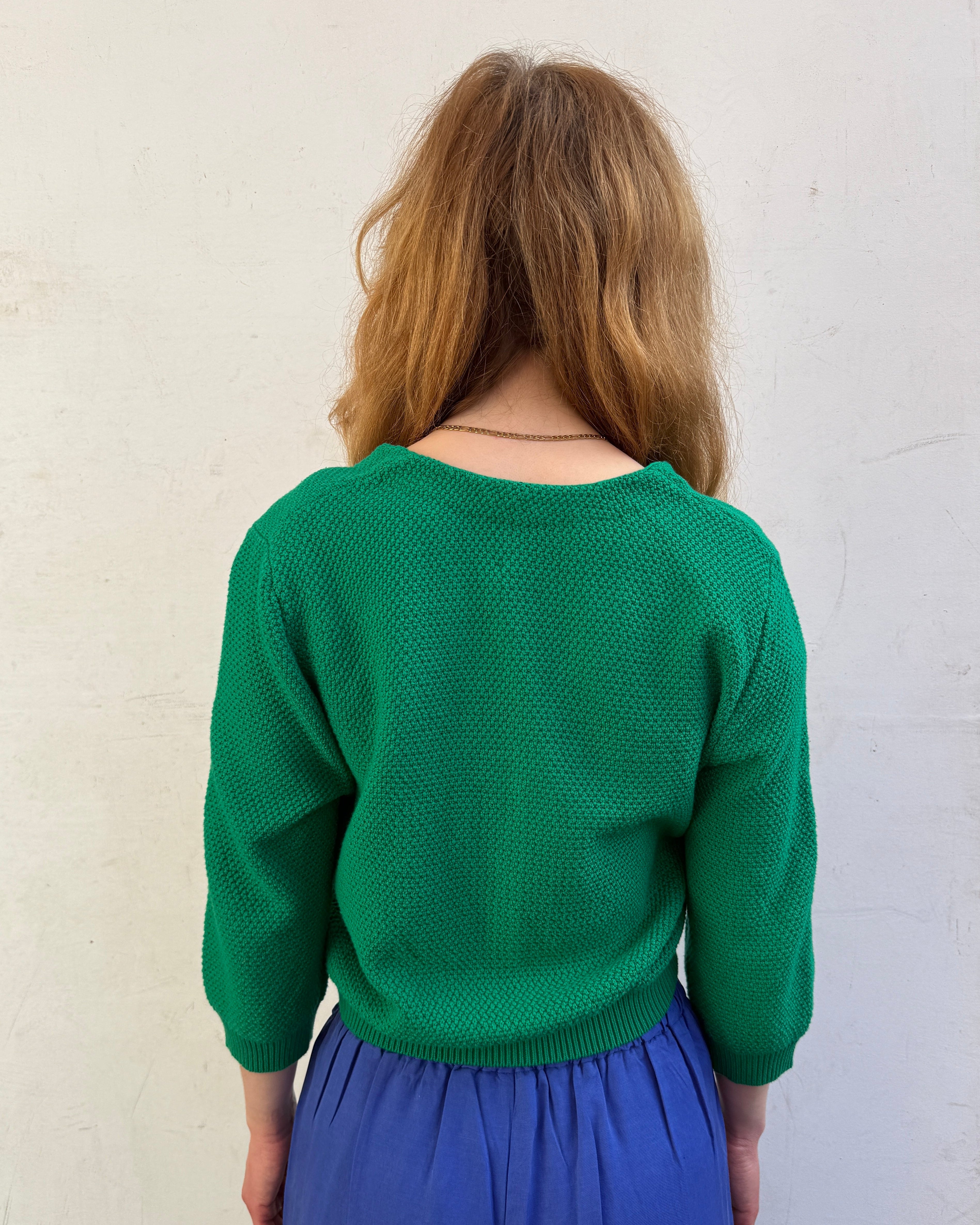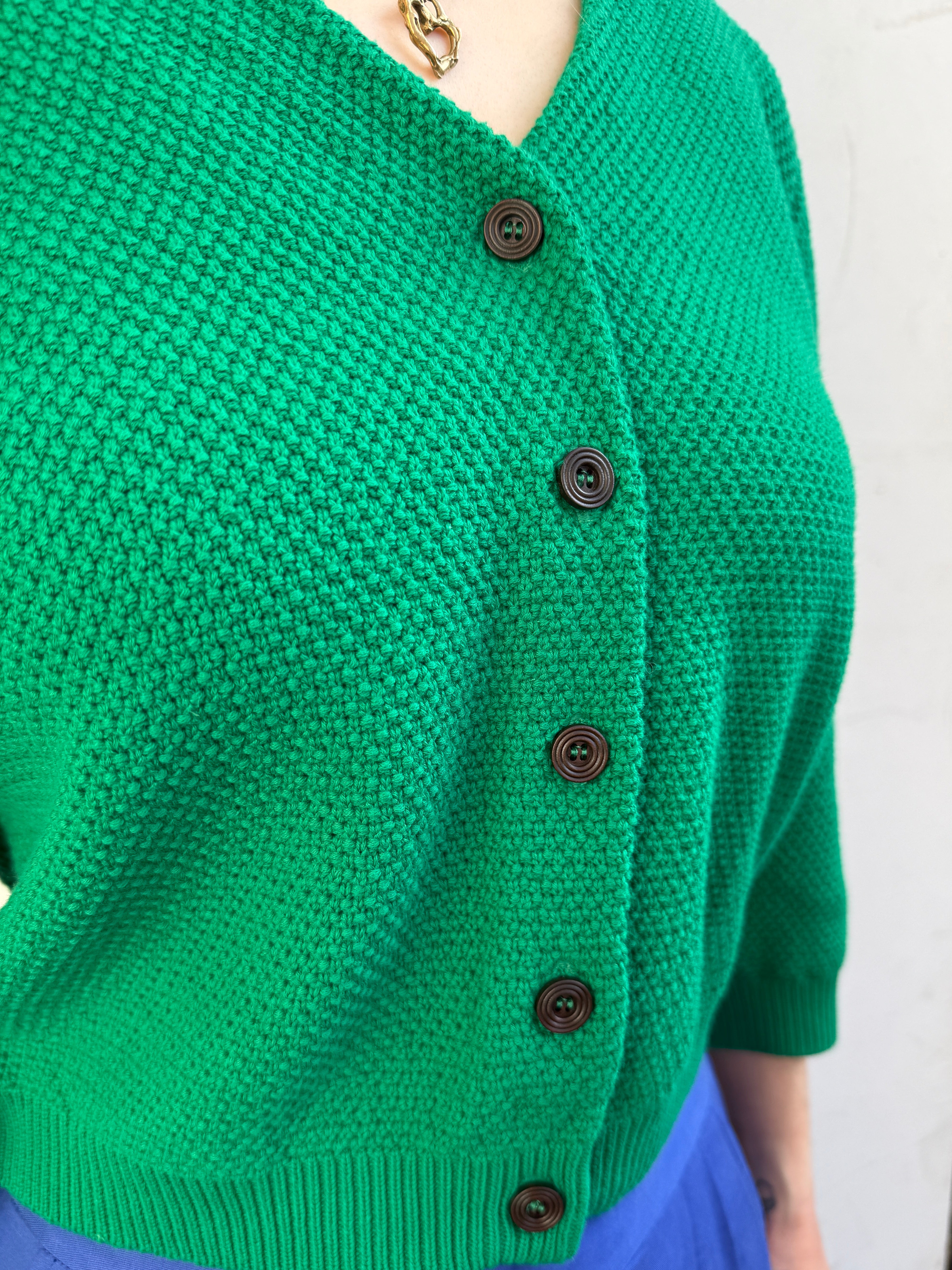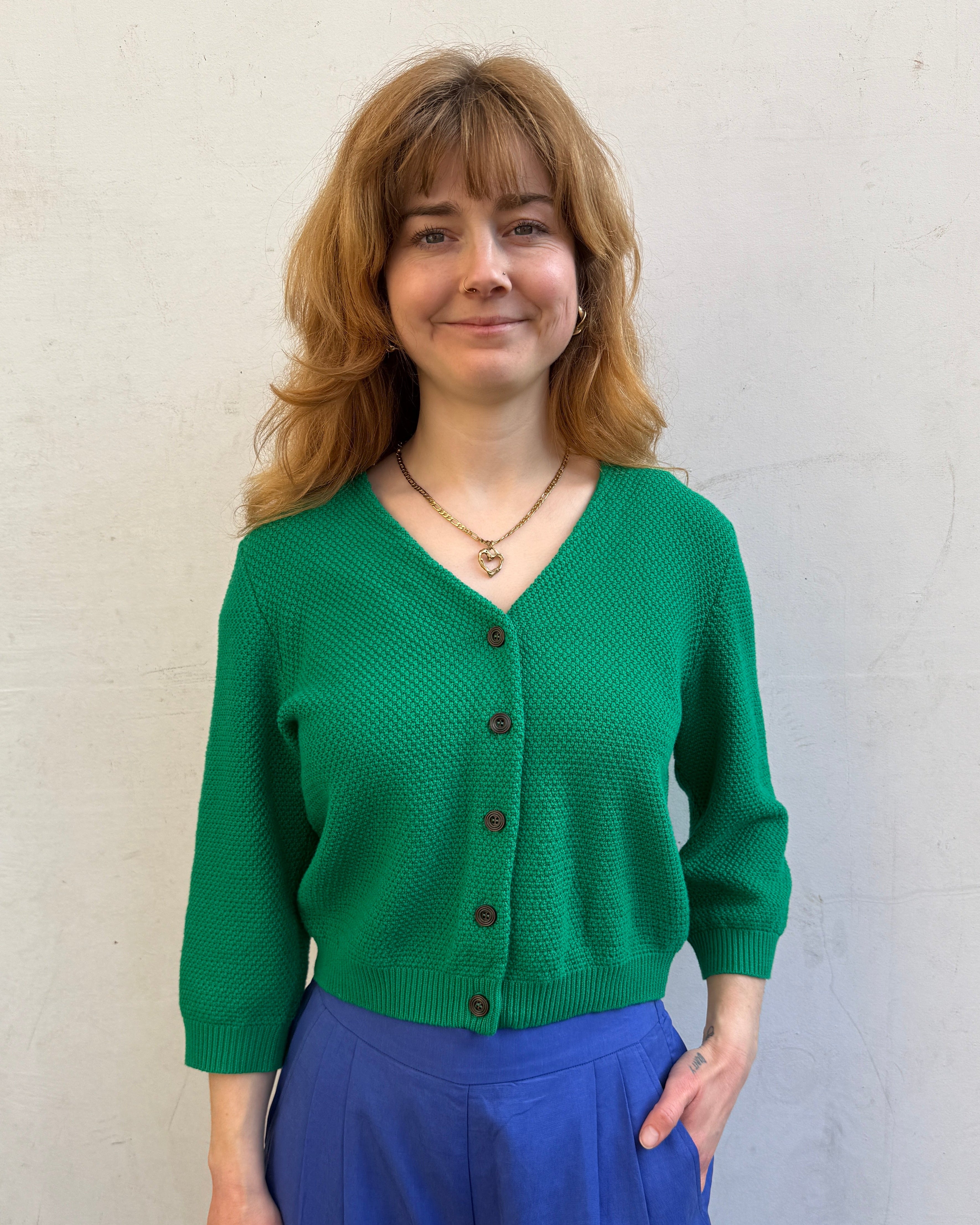 A bright, easy-wear knit designed to bring a pop of colour to everyday dressing. Made from soft, breathable organic cotton, this green cardigan features a moss stitch (waffle knit) texture that adds subtle depth to the fabric.