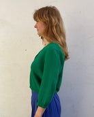 Cut with a flattering V-neckline and relaxed 3/4 length sleeves, it’s finished with a classic button-through front and neat ribbed trims. An effortless layer that works worn buttoned-up as a top or thrown over a tee or dress.