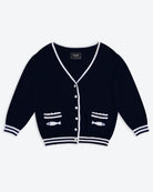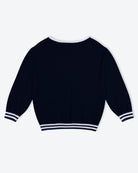 A playful knit with a nod to seaside nostalgia. Made from soft, breathable organic cotton, this dark navy cardigan features contrast trims and subtle knitted fish motifs on the front pockets.
