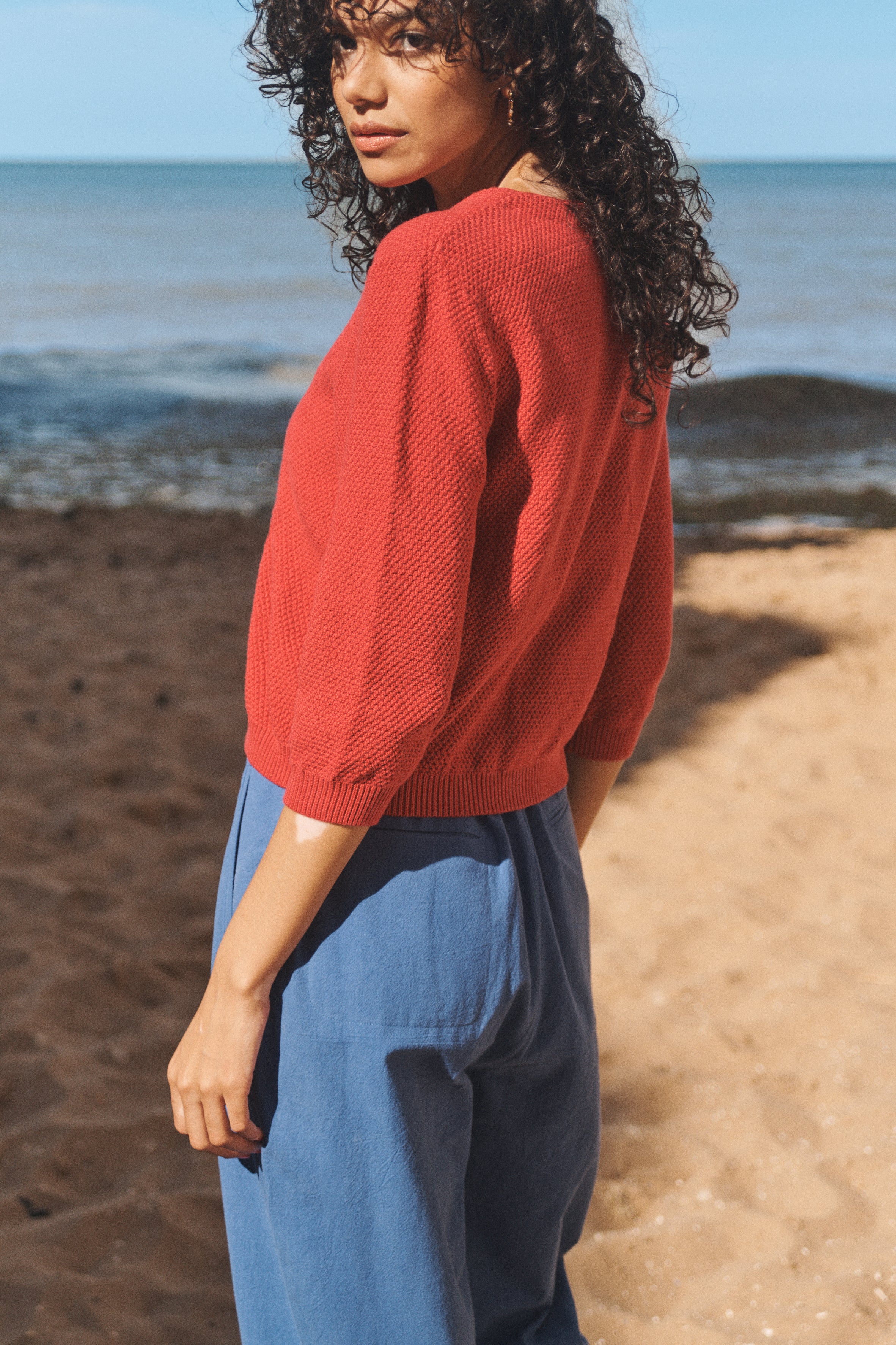 A bright, easy-wear knit designed to bring a pop of colour to everyday dressing. Made from soft, breathable organic cotton, this red cardigan features a moss stitch (waffle knit) texture that adds subtle depth to the fabric.