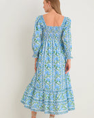 The Margarita dress is a refined, easy-to-wear style, hand block-printed in rich blue and green tones. Delicate border detailing highlights the neckline and waistband, while a softly gathered midi skirt and smocked back create a flattering, comfortable fit.