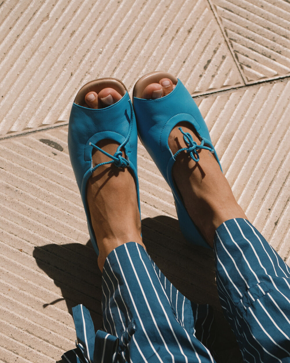 These leather ballet flats by Tiny Big Sister offer a playful update on a classic silhouette. Designed with a soft open toe and delicate tie-front detail, they bring a fresh pop of colour while remaining effortlessly easy to wear from day to night.