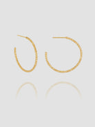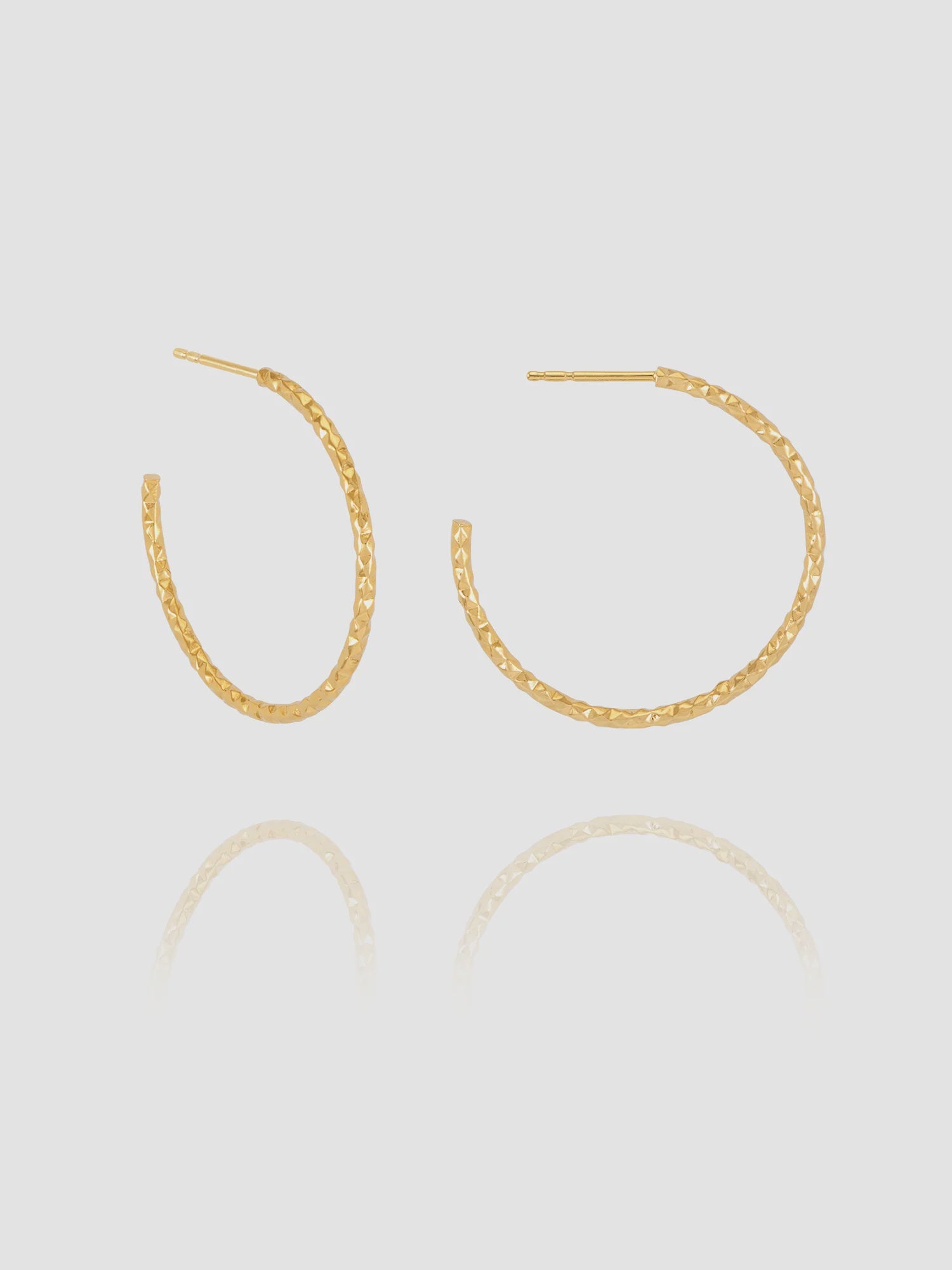 Daily Reflections, Lighter Than a Journal. The Shimmering Sun Hoop Earrings are a cross-seasonal wardrobe essential designed to wear solo or as part of a stack. Hand-crafted from 22ct gold plated recycled silver and using a diamond-cut technique, these paired-back beauties shimmer when they catch the light. Butterfly backs make for a secure fit, and easy on-and-off.