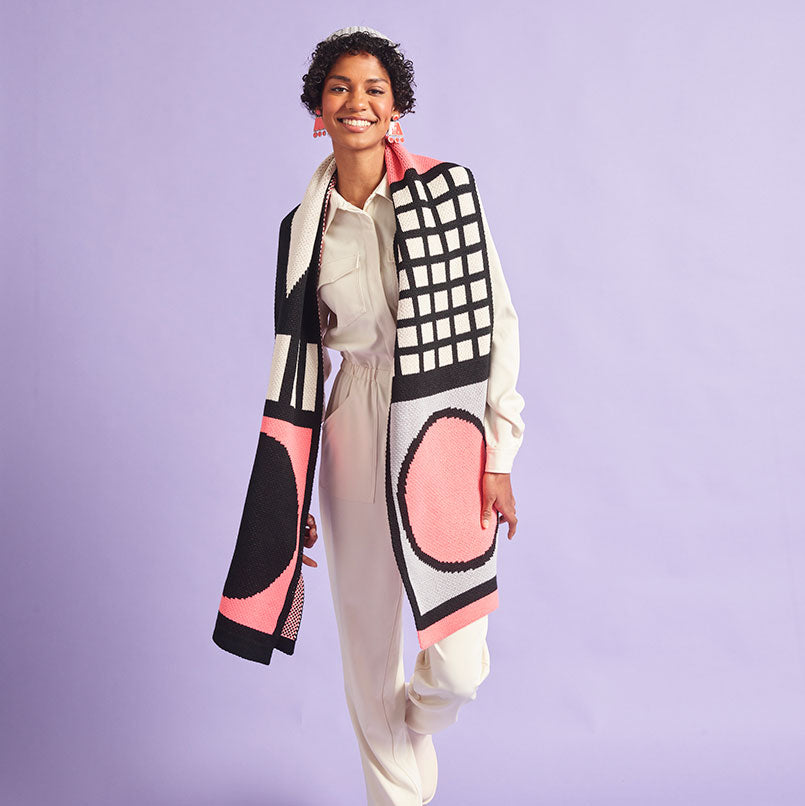 Taking inspiration from the Memphis art movement, the postmodern aesthetic of this all-encompassing scarf features bold design and geometric shapes outlined in black cut across the full length, filled with pink, black and grey. Contrasting coloured edging complete this memorable design.