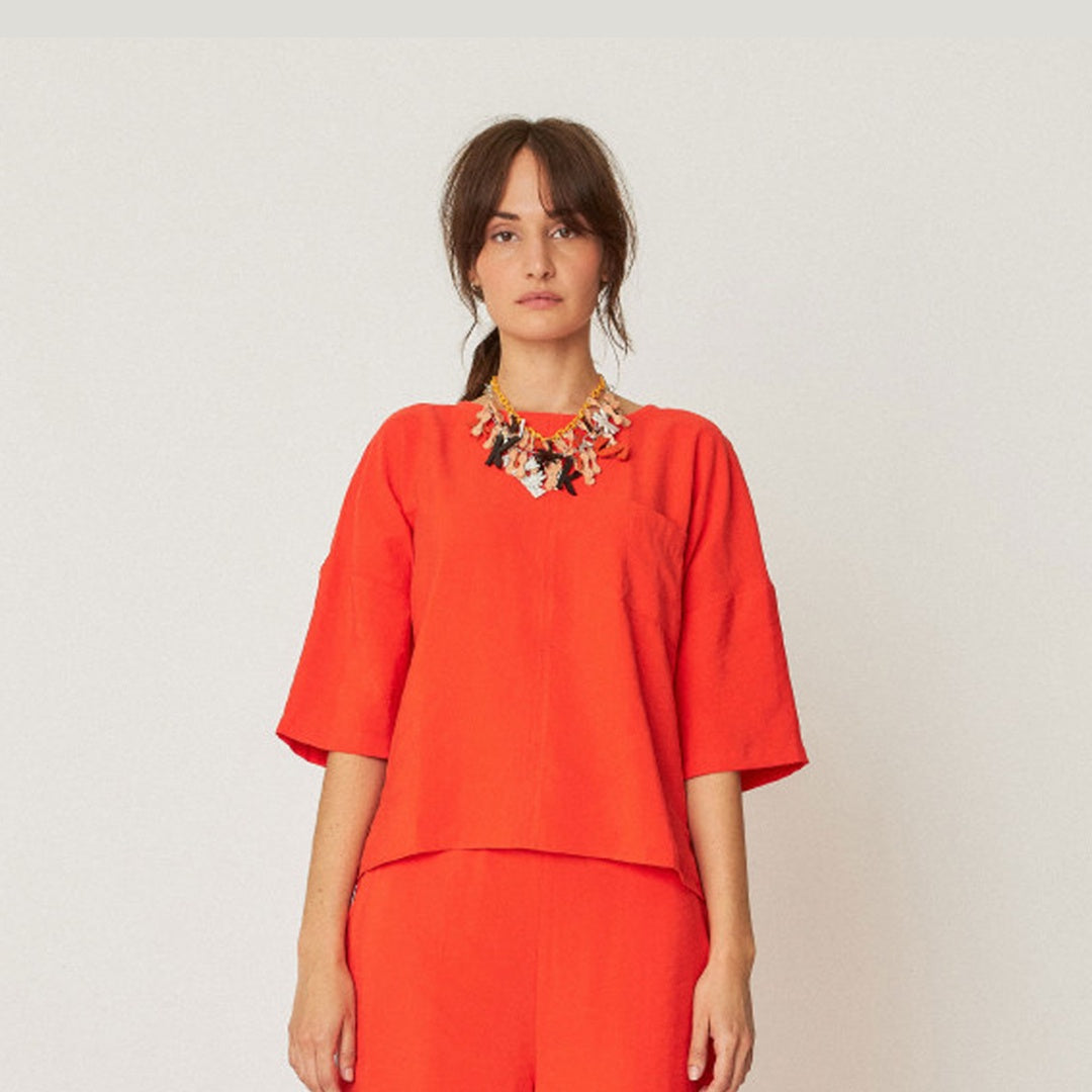 Bright and breezy, the vibrant orange Maitia shirt from SKFK is a lightweight, loose-fitting blouse designed with effortless style in mind. Featuring short sleeves, dropped shoulders, a round collar, and a chest pocket, it’s finished with subtle side slits for an easy, modern silhouette—crafted especially for women who love a relaxed yet refined look.