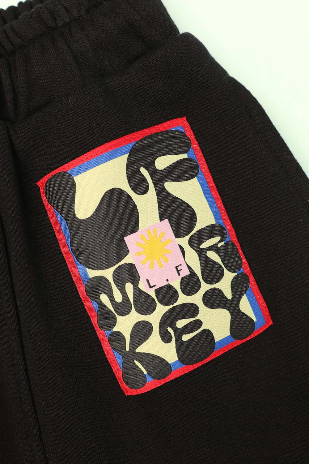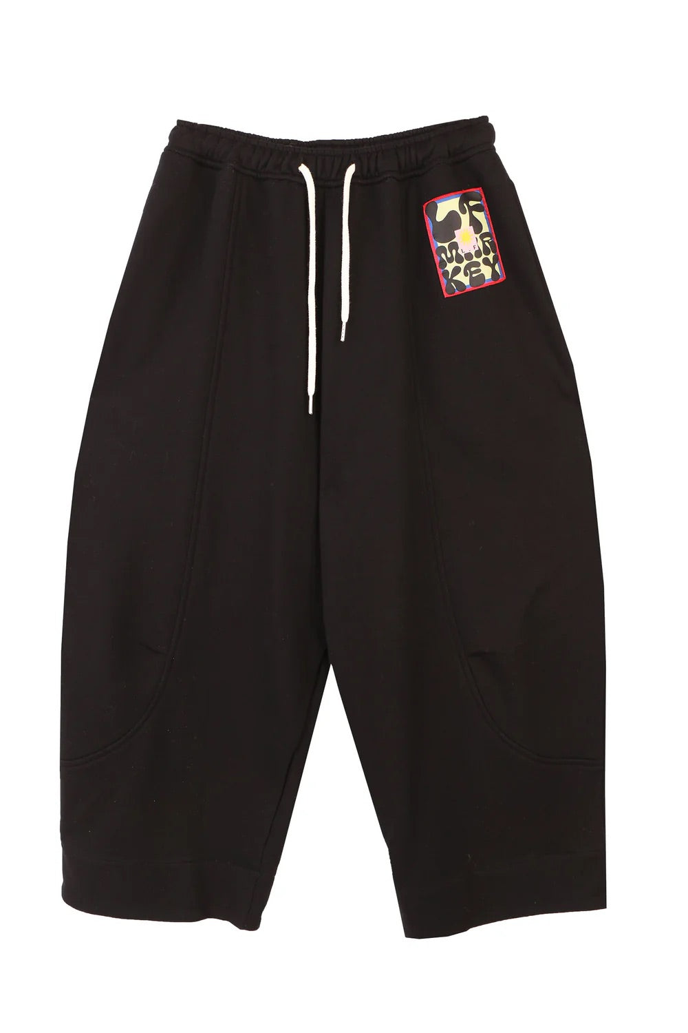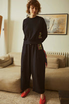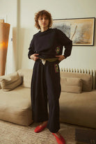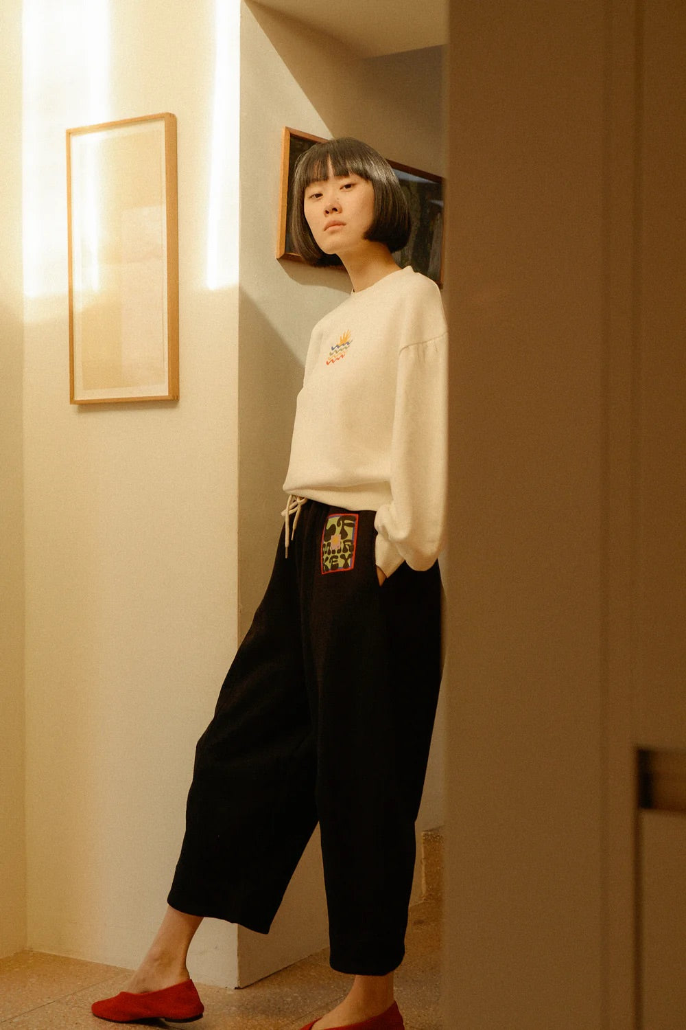 The Camden Trouser by L F Markey has a barrel-shaped leg and a high waistline with a drawstring. Crafted from cotton fleece with an illustrated woven patch logo on the front. With side seam pockets and a back patch pocket.