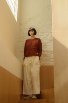 The Workpant by L F Markey is a roomy, workwear-inspired trouser with a wide leg and spacious fit. Designed to be worn high-waisted, with front pleats adding to the voluminous shape. With workwear-inspired pockets and loop detail.