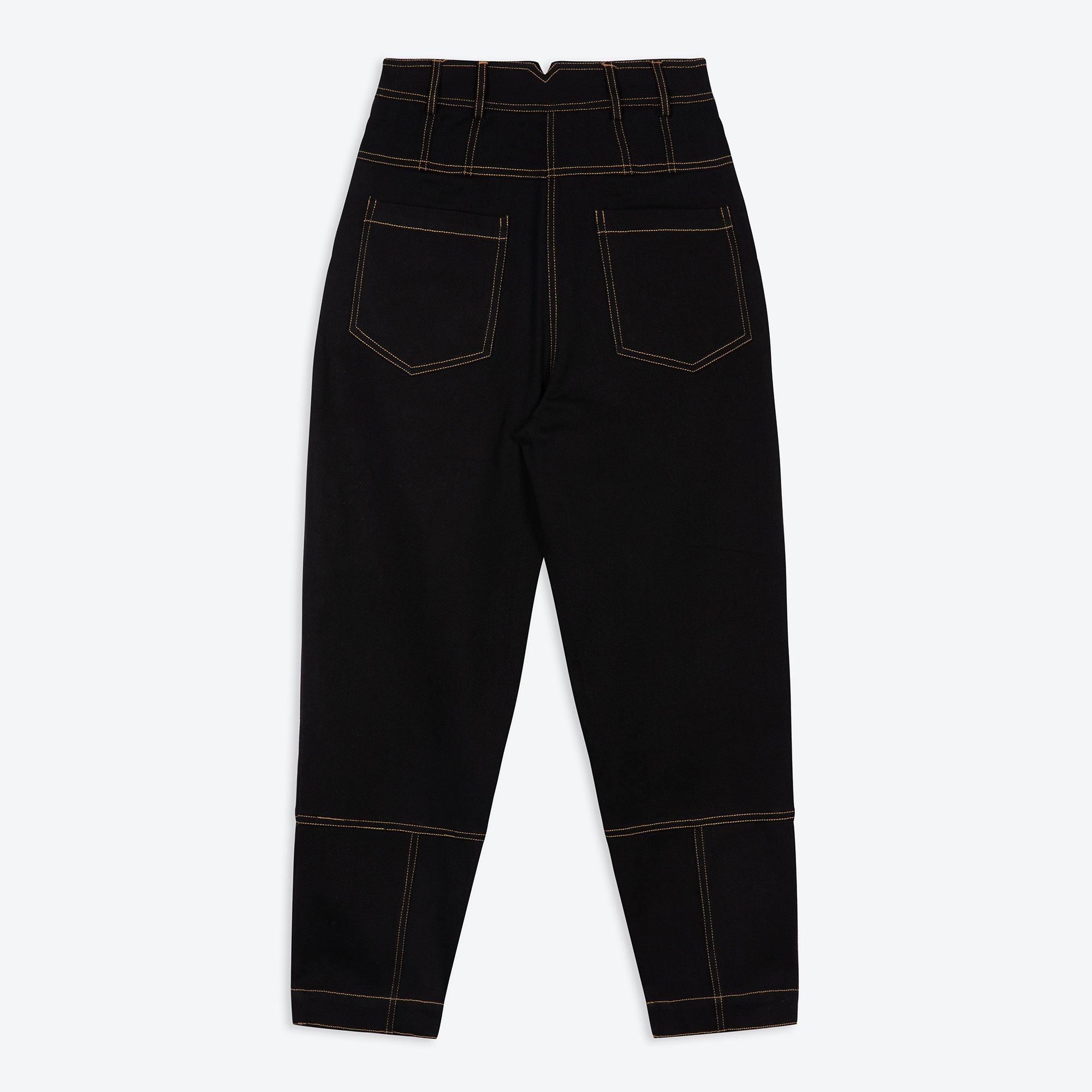 FEATURES: Baggy fit legs, slanted side pockets, exposed stitching, brass button fastening, belt loops.