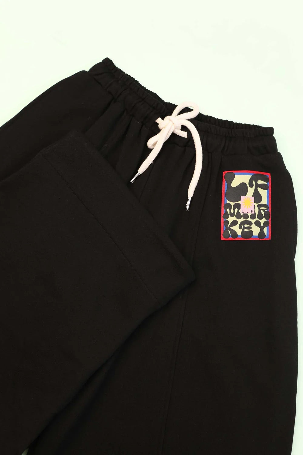 A pair of black trousers with a multicolored scribble print. The trousers have a high-rise fit with an elasticated waistband and side pockets.