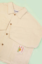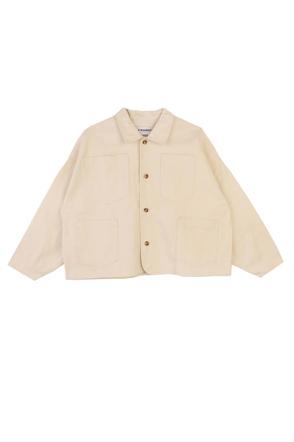 FEATURES: Chore coat, boxy silhouette, utility-style patch pockets, imitation horn buttons, workwear-inspired design.