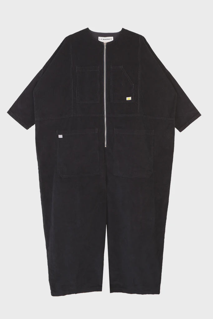The Mega Boilersuit by L.F. Markey is a best-selling style, here with long sleeves in navy blue cotton corduroy. Designed with a spacious, relaxed fit, it offers plenty of room for movement. It features a silver front zip, utility-style pockets and mini wave and mini sun woven patch logos.