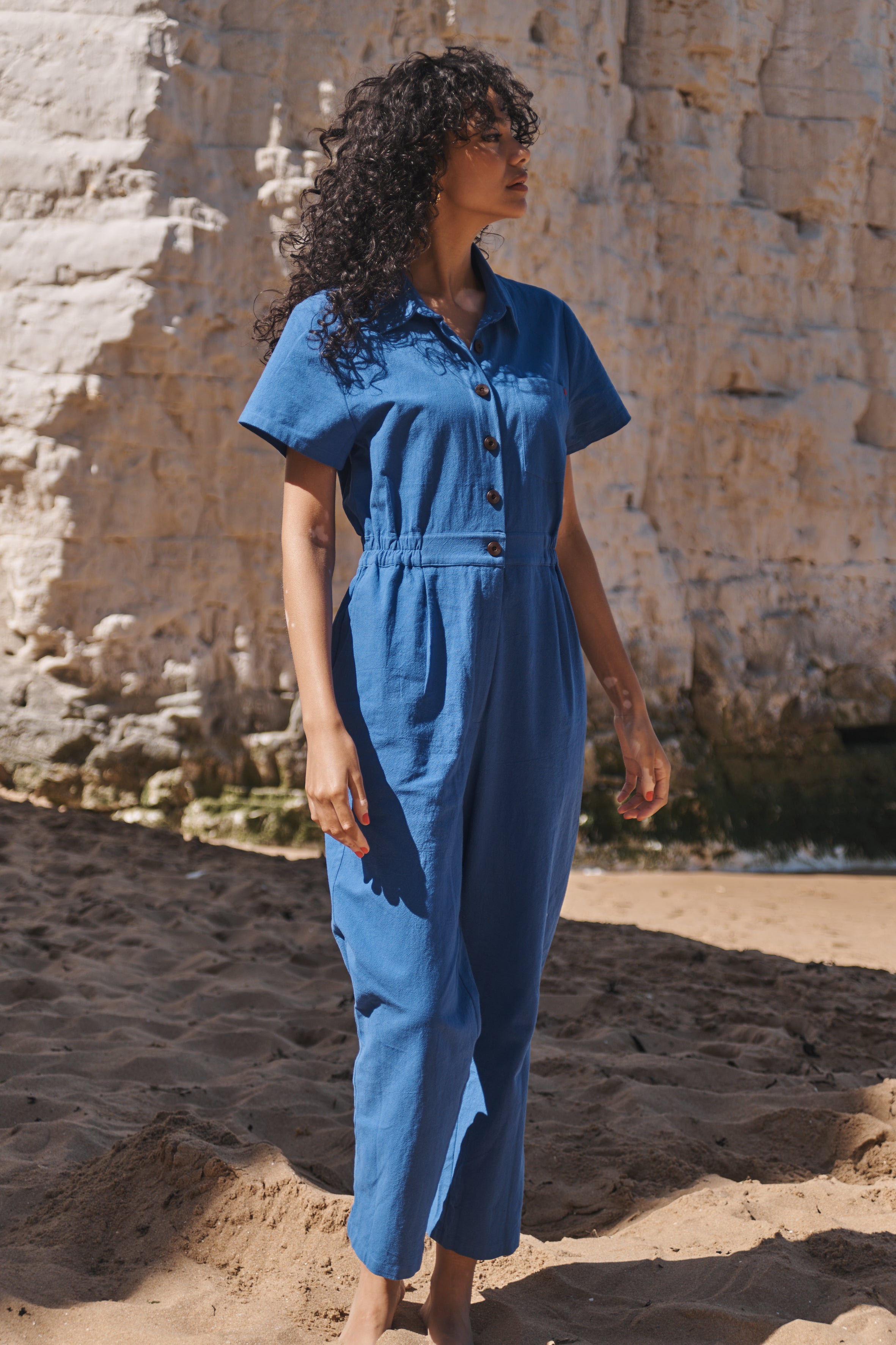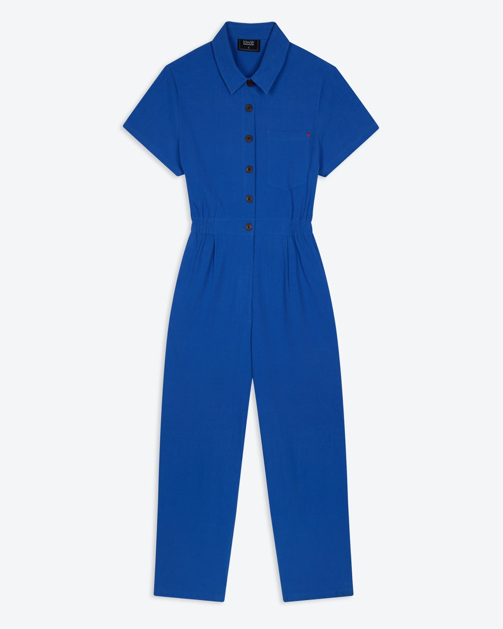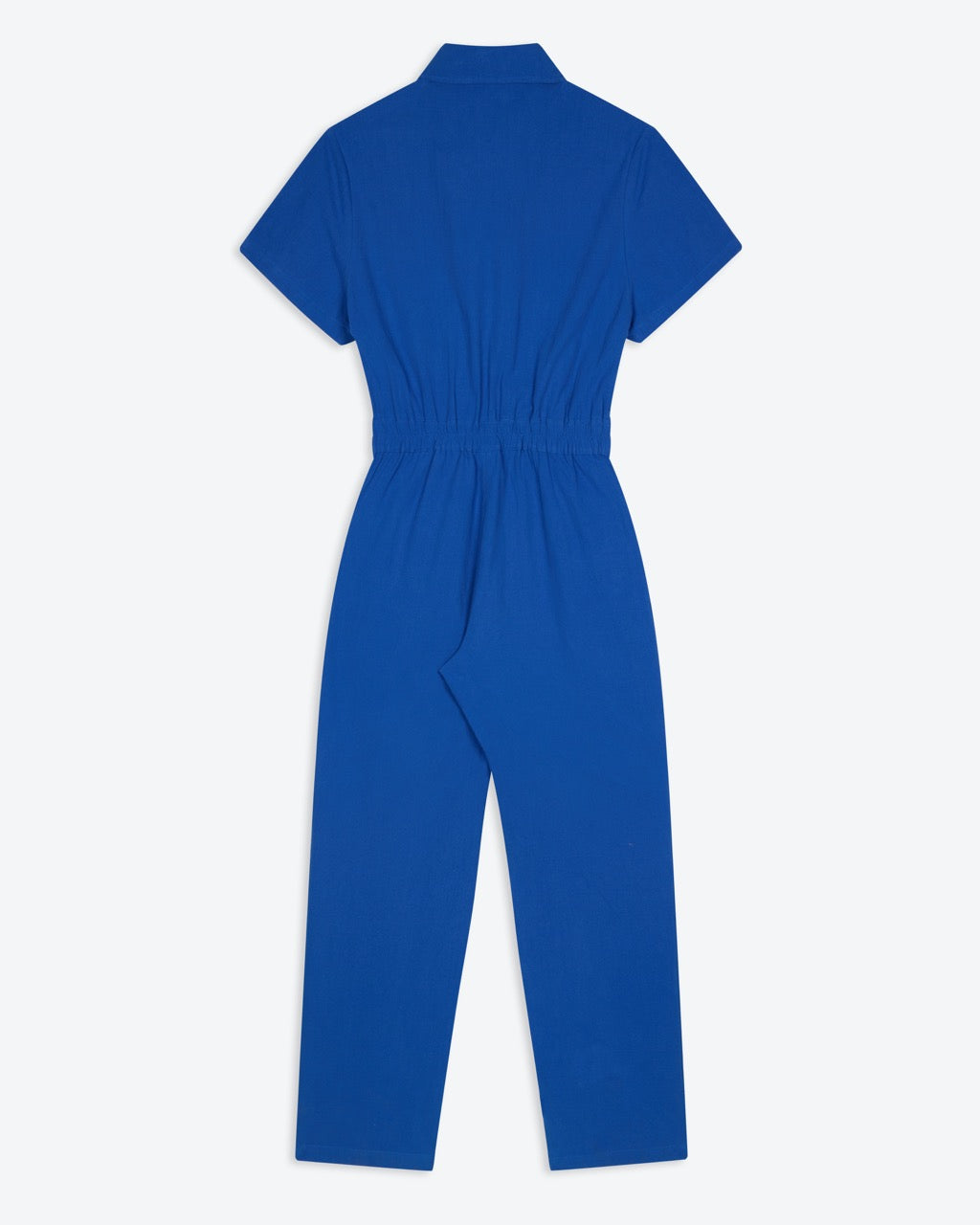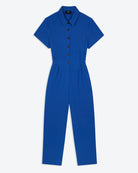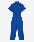 Our short-sleeve cobalt boilersuit features a classic shirt collar and button-through front, creating a clean, streamlined silhouette. Cut with a softly elasticated waist for shape and comfort, it falls to a full-length straight leg for an easy, modern fit. Crafted from durable cotton in a vibrant blue, it’s finished with side pockets and a chest pocket with subtle red stitch detailing for a considered touch.