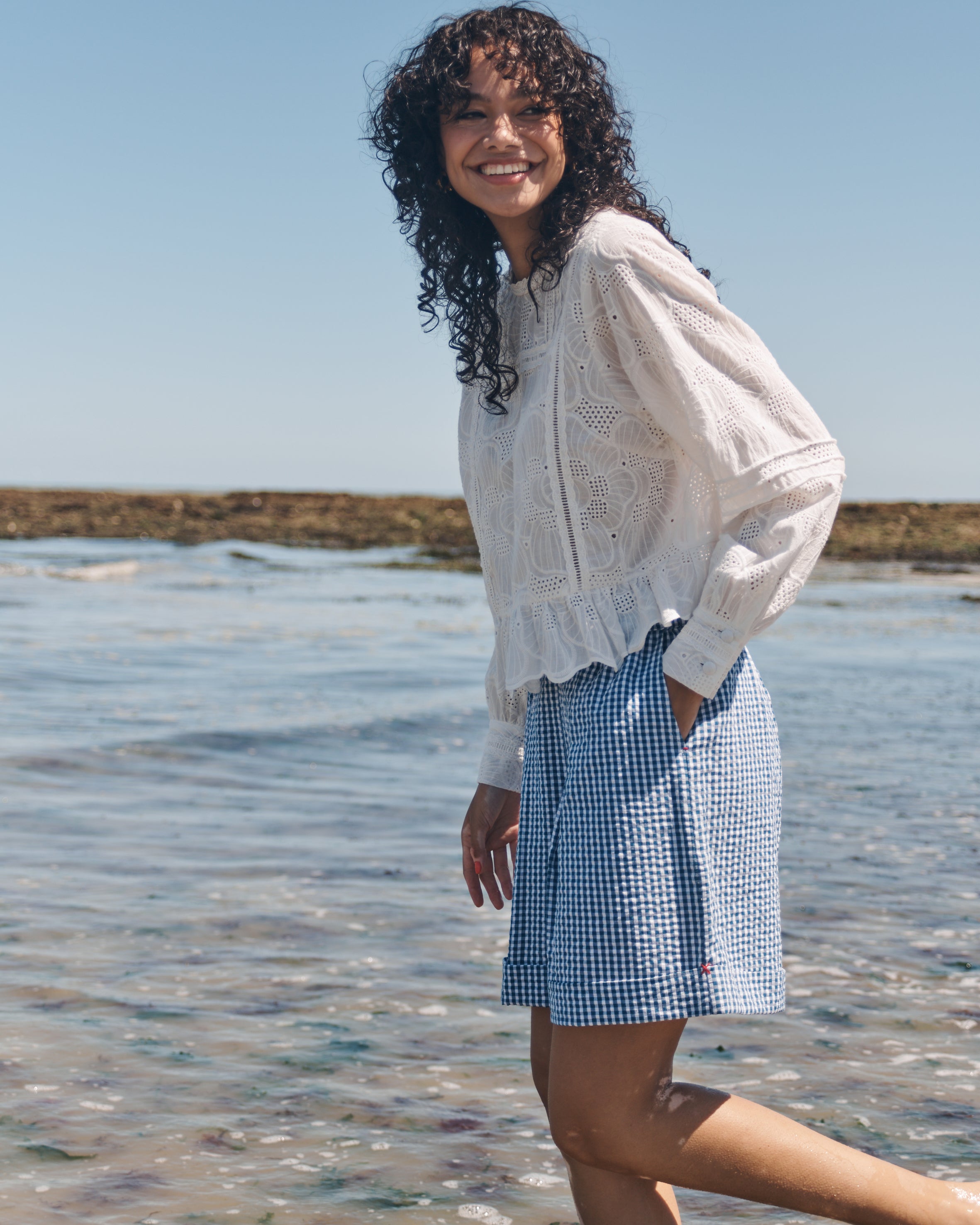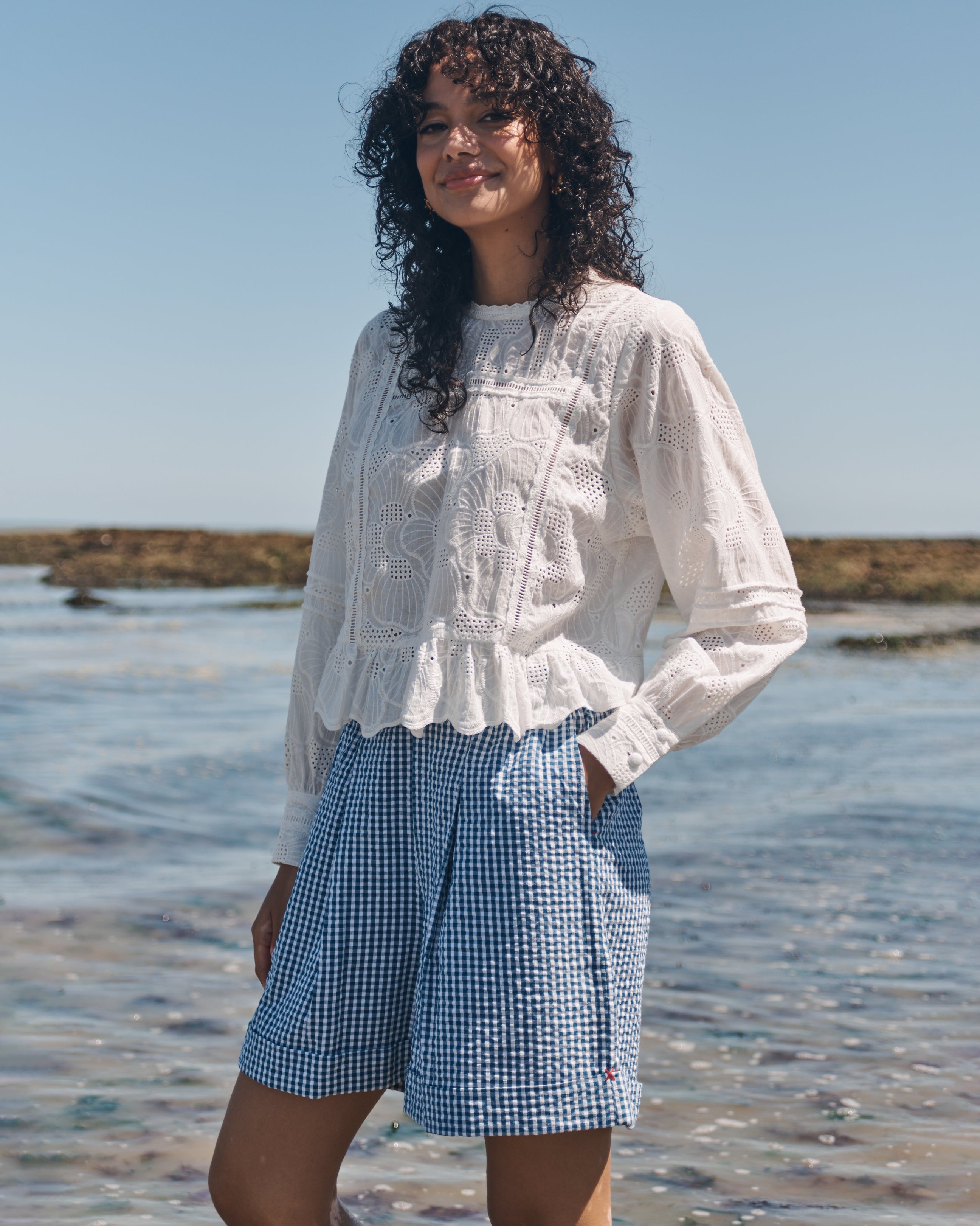 Our new gingham shorts are crafted from lightweight cotton seersucker for a breathable, textured feel. The timeless check is elevated with hand-embroidered red cross-stitch detailing at the side on the turn up. These easy shorts have elastic at the back and have a wide leg with a turn up. Roomy side pockets and pleats at the front finish them off perfectly.