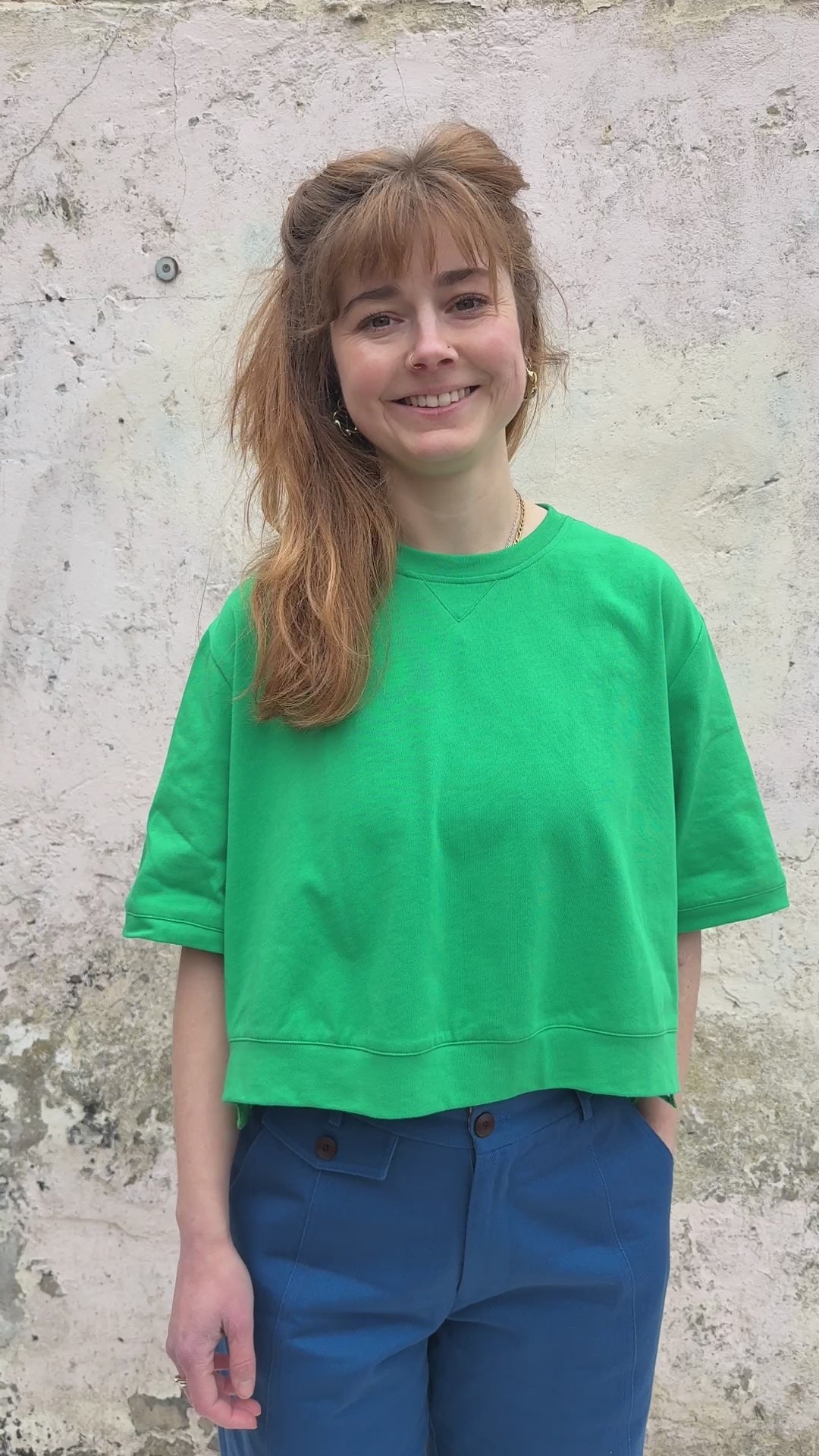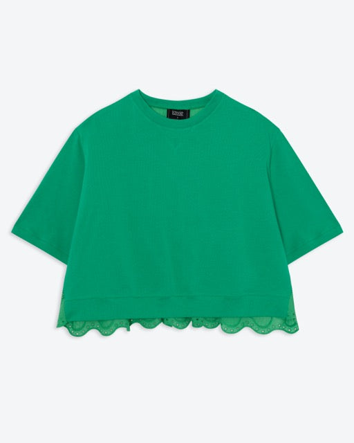 Our short-sleeve shirt is crafted from soft cotton jersey in a vibrant green. Designed with a relaxed, boxy fit, it features a classic crew neckline and an easy dropped shoulder for everyday comfort. The back reveals a beautiful broderie anglaise panel with delicate cutwork detailing, gently gathered for added movement and shape. A scalloped hem peeks out beneath the front, adding a playful, elevated twist to an everyday staple.
